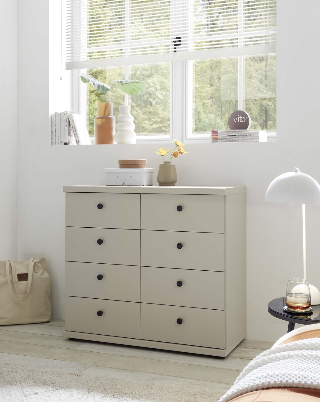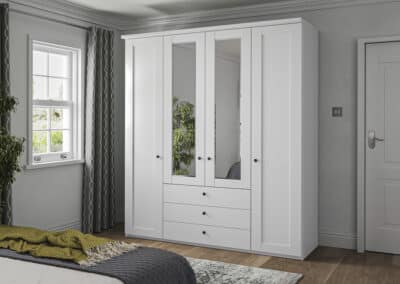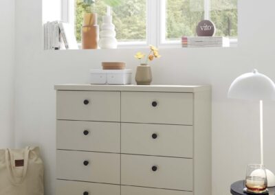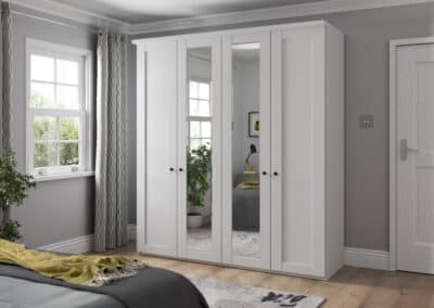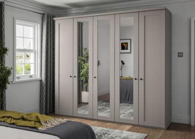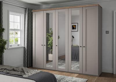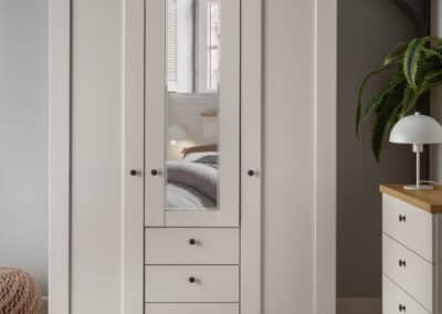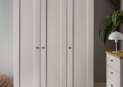 Shaker-style for 2025, this timeless classic is available as a hinged-combi wardrobe with matching accessories in a variety of colours including white, pebble grey and sage green. Matt black circular handles set it apart and give it an up-to-date vibe. It’s the little details which count!