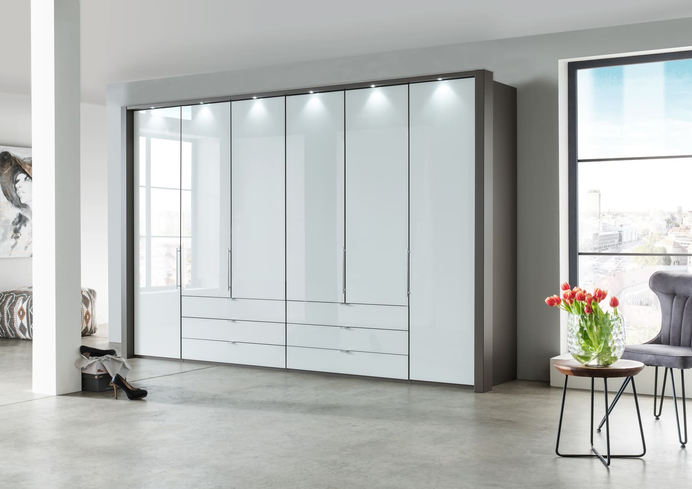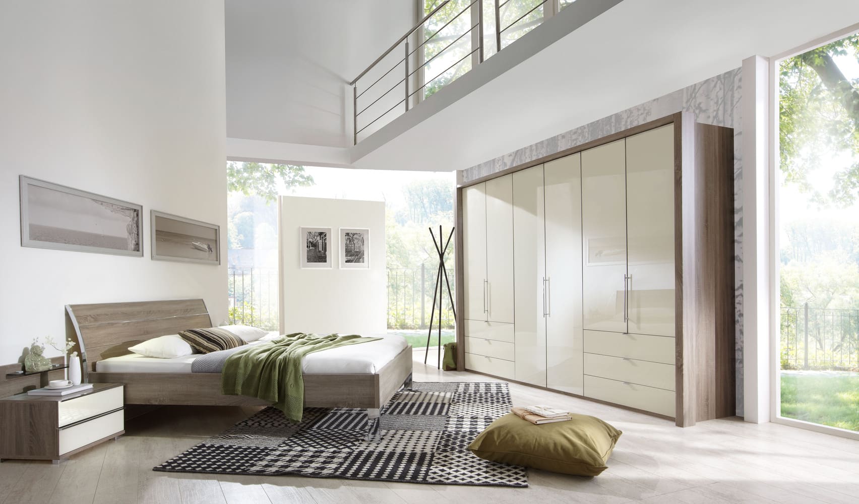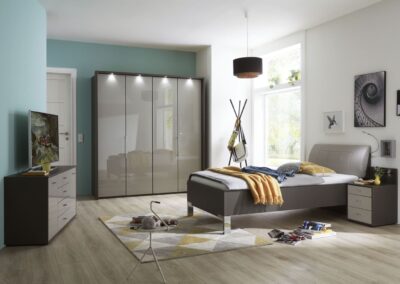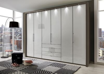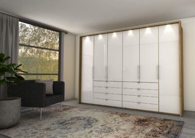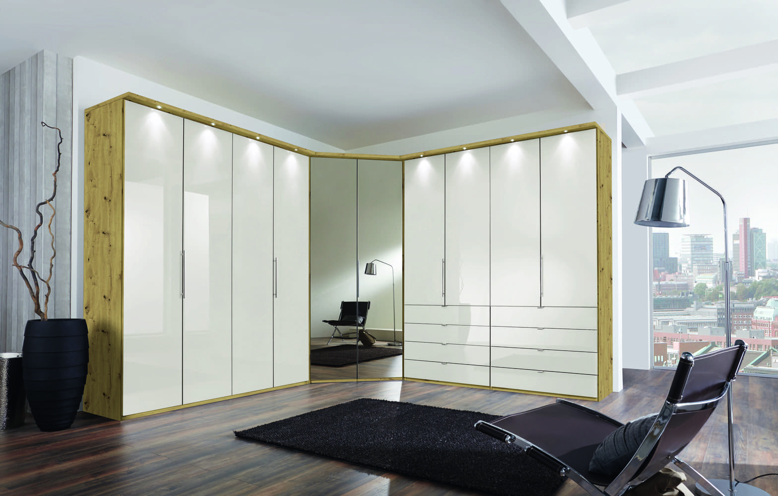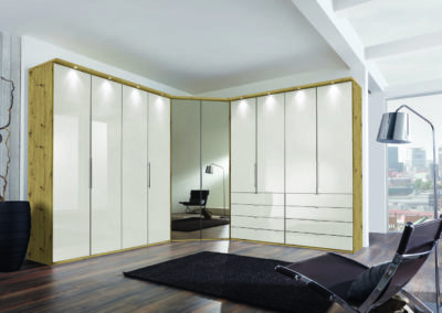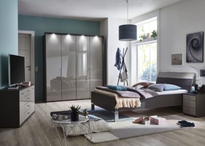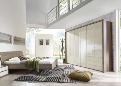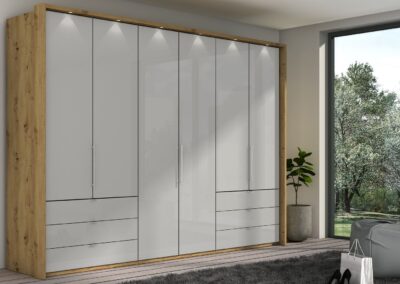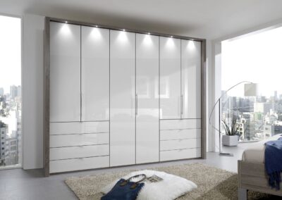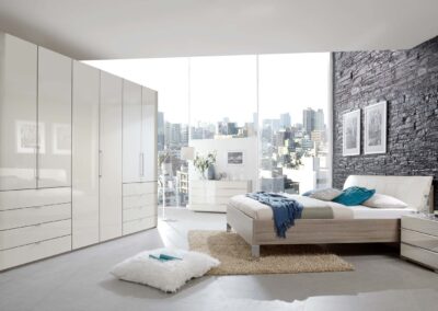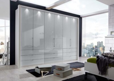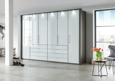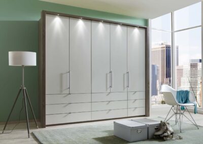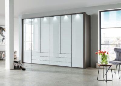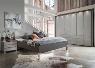 The exciting Loft range in a wide range of finishes takes combination wardrobes to new heights, with versatility guaranteed. Choose from single, 50cm units right up to 4 metre, eight door arrangements, with bi-fold doors. Cupboards are either full length or you can have drawers below plus there is a spacious corner unit. Interiors are smart grey and white striped and internal shelving fittings include a swivel shelf – perfect for TVs. Handles, trims and feet are in chrome or slate grey. Naturally, there’s the usual range of storage chests and a bed to match.