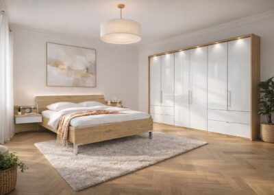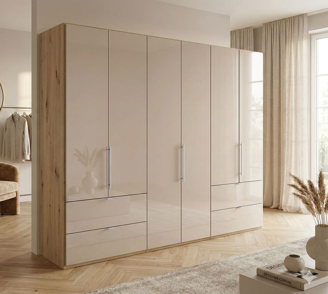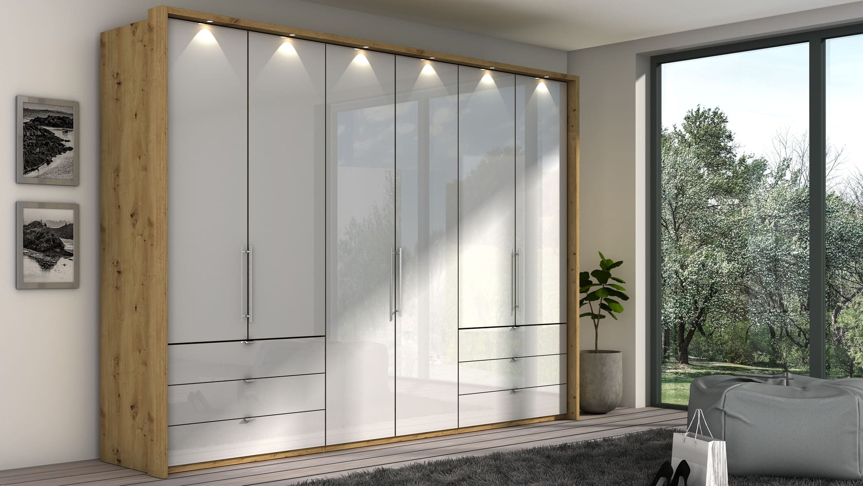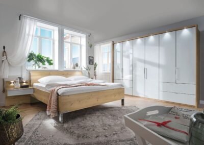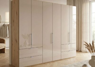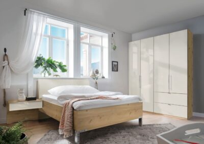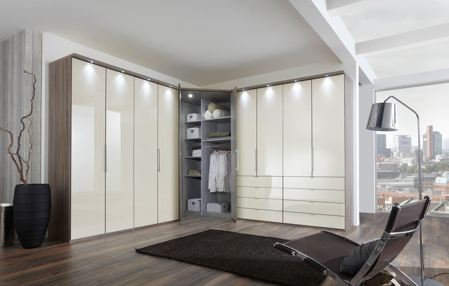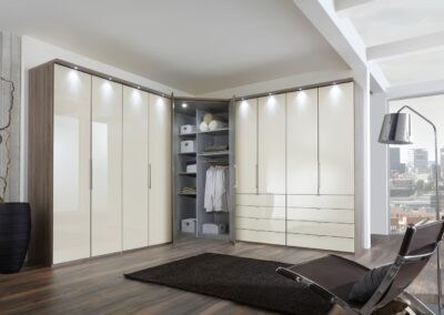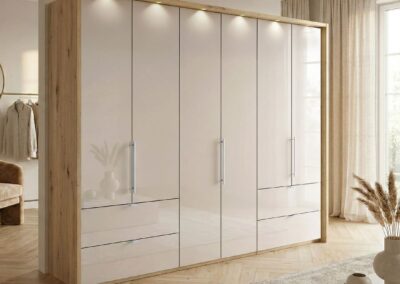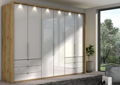 The exciting Loft range in a wide range of finishes takes combination wardrobes to new heights, with versatility guaranteed. Choose from single, 50cm units right up to 4 metre, eight door arrangements, with bi-fold doors. Cupboards are either full length or you can have drawers below plus there is a spacious corner unit. Interiors are smart grey and white striped and internal shelving fittings include a swivel shelf – perfect for TVs. Handles, trims and feet are in chrome or slate grey. Naturally, there’s the usual range of storage chests and a bed to match.