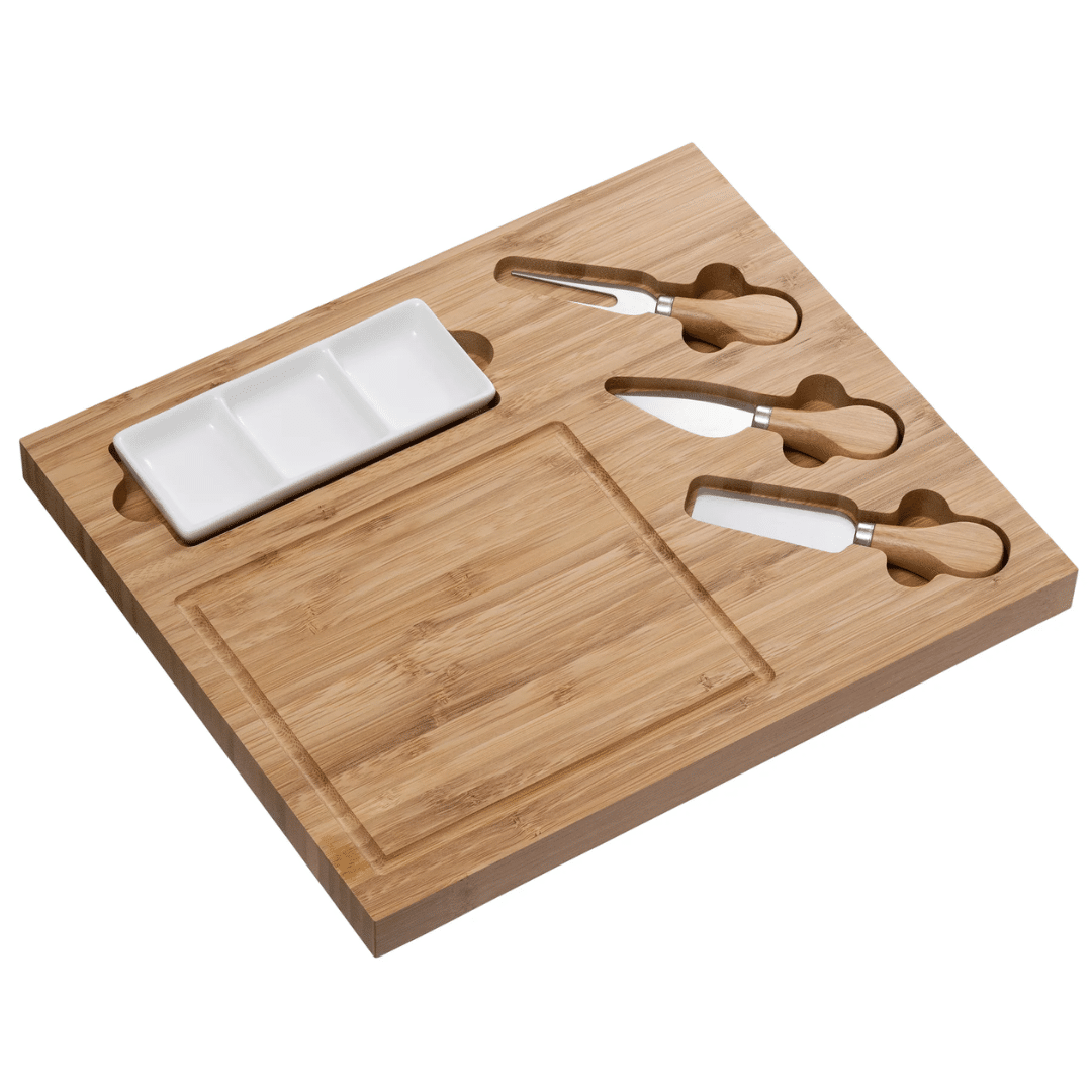 BELLEEKLIVINGs new Cheese Board and Knife set is ideal for entertaining. Impress your guests with a beautifully displayed snack board. The board is crafted from bamboo wood and comes complete with knife set and divided dish.