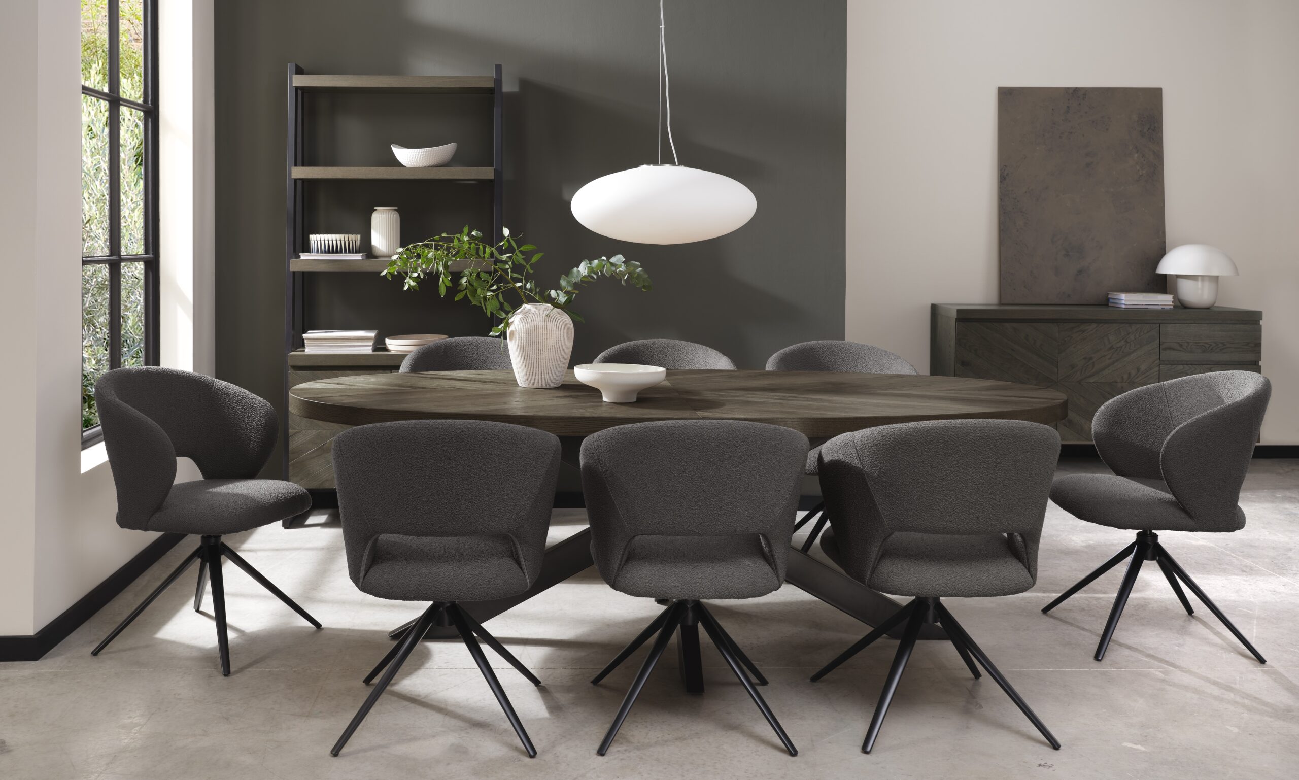Bring warmth and style to your dining room with the Ellipse Fumed Oak 8 Seater Table – handcrafted oak top with bold metal base, perfect for 6 diners.