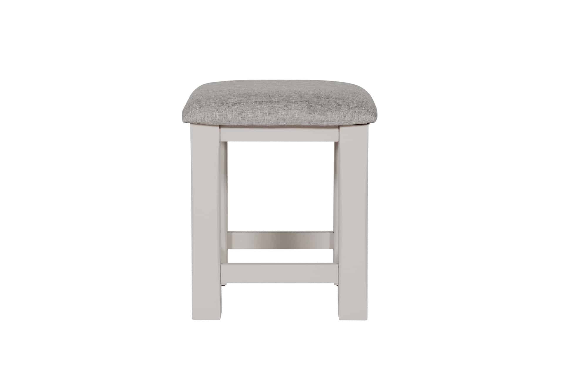 Doune Dressing Stool in Taupe. This versatile stool features a padded cushion seat covered in soft fabric for comfort and support. Its stylish painted finish adds a touch of elegance, making it a chic addition to any bedroom or vanity space.