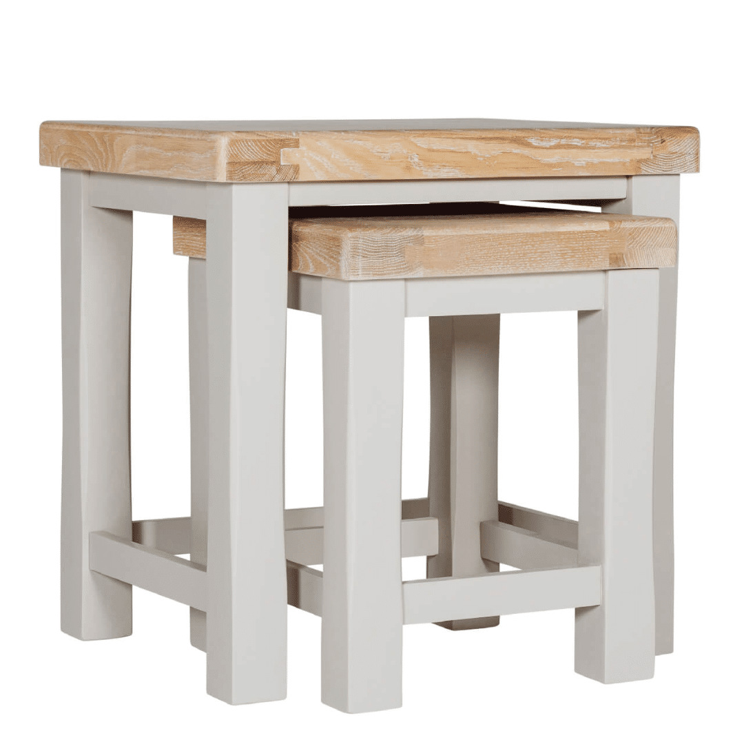 Doune Nest of Tables in Taupe brings a touch of sophistication to your space with its versatile design, elegant painted finish and oak top. Perfect for any room, these tables offer flexible functionality to suit your needs.