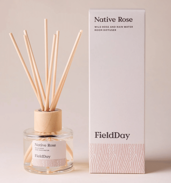 Our Native Rose Diffuser with fragrance notes of Wild Rose and Rain Water in a glass jar with wooden cap and unbleached reeds.