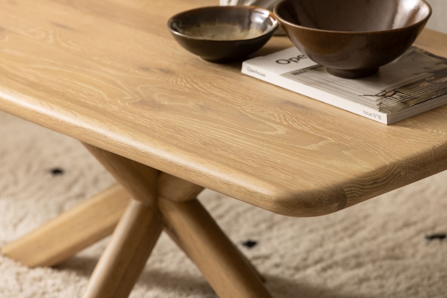 Baker Furniture Flynn Coffee Table in solid white oak with whitewash finish. Rustic yet modern design, showcasing natural wood grain for a timeless, airy look