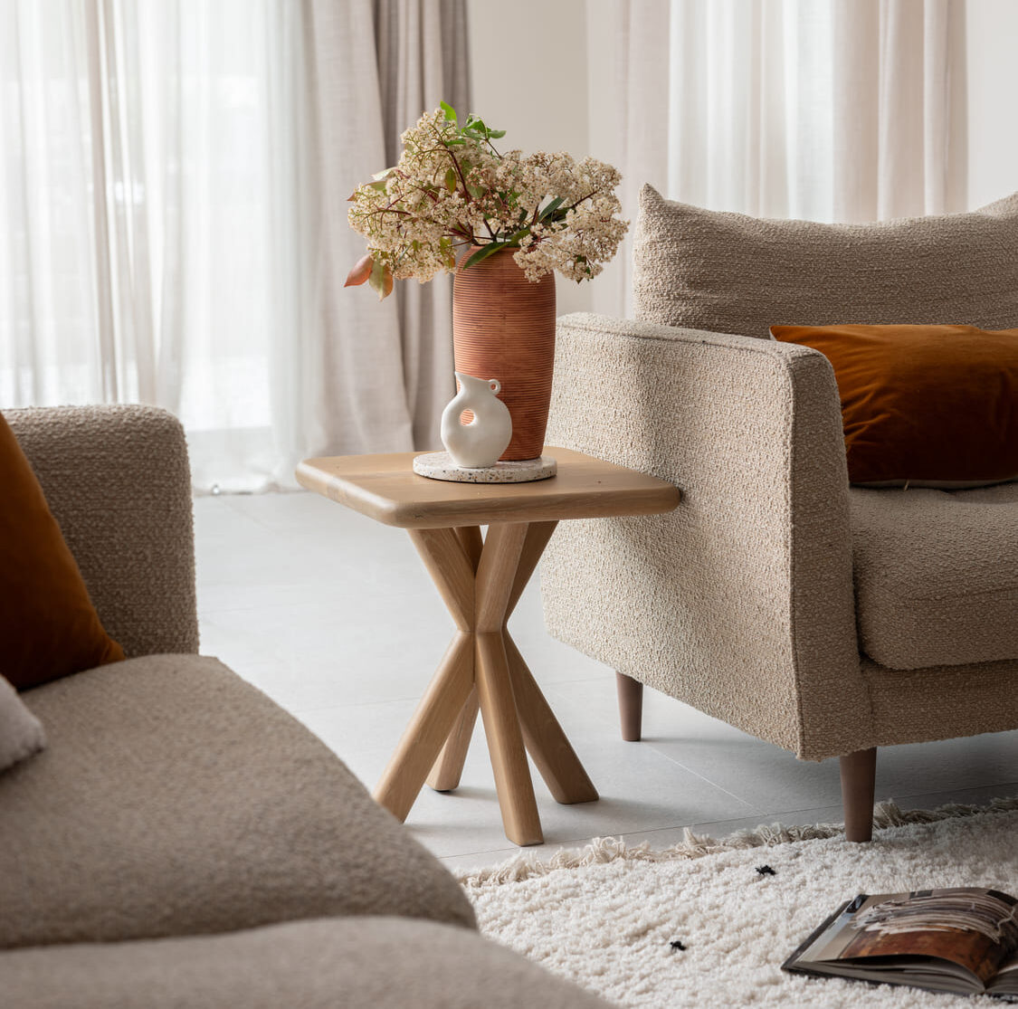Discover the Baker Furniture Flynn Lamp Table in solid white oak. With dimensions H50cm x W45cm x D45cm, this whitewashed side table blends rustic charm with modern design, showcasing natural oak grain. Ideal as a compact lamp table for living rooms, bedrooms, or lounge spaces