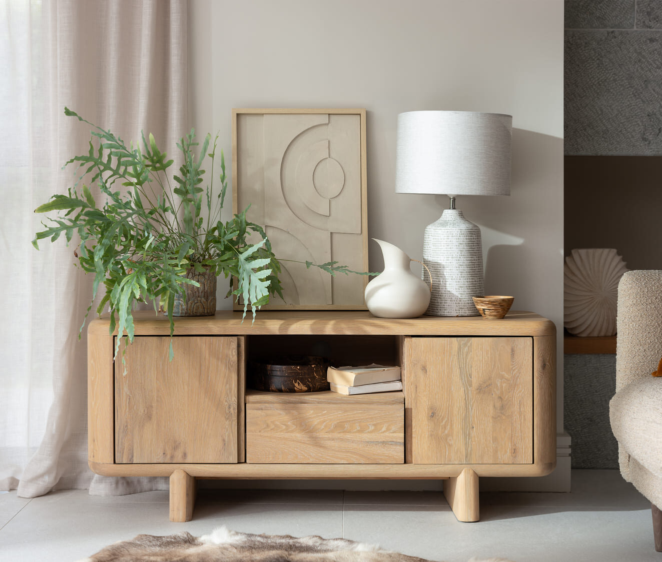 Baker Flynn TV Unit – MDF with White Oak veneer, soft whitewash finish. Rustic-modern design, H55×W130×D40 cm, perfect for stylish, versatile living rooms.
