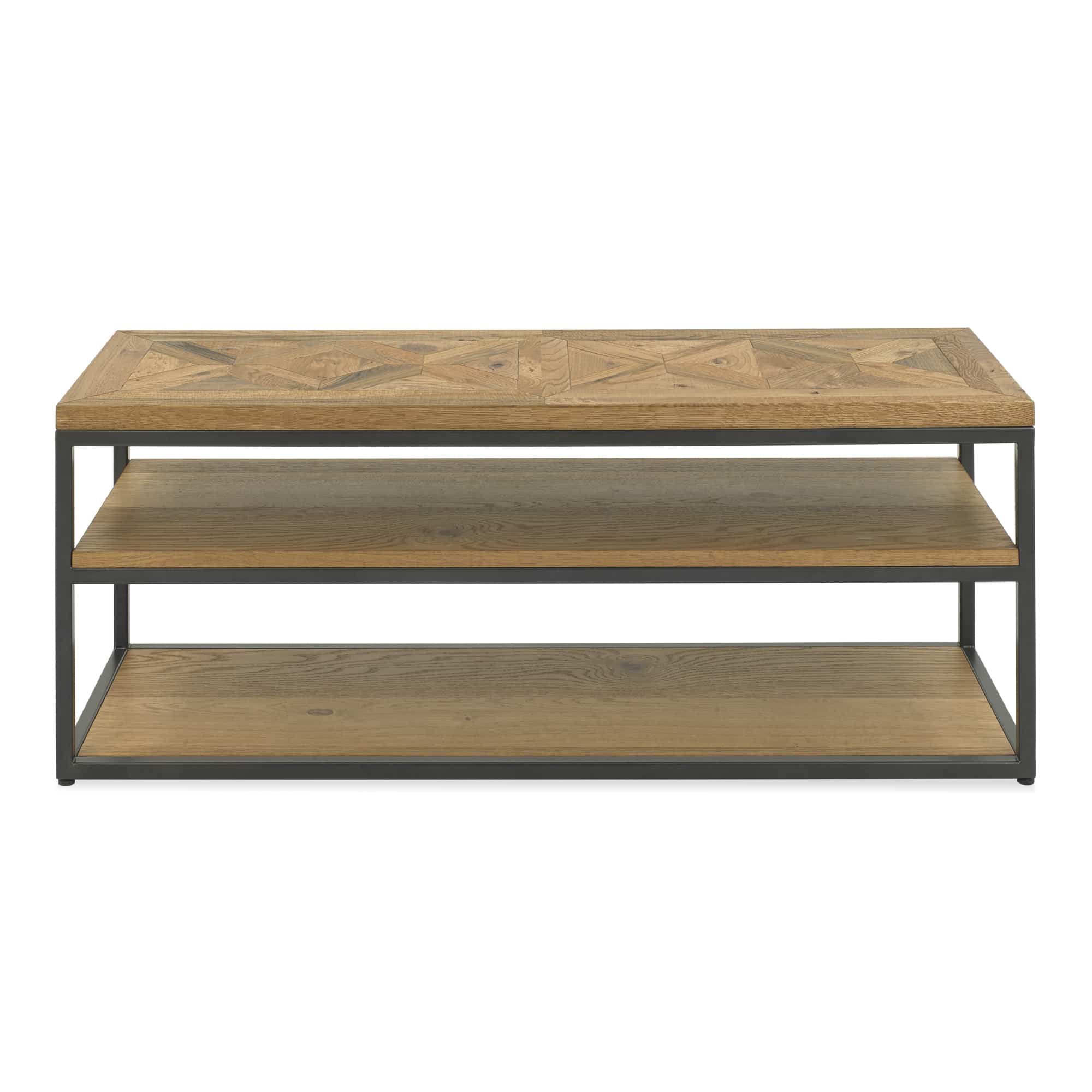 Indus is a striking design combining saw cut oak marquetry tops with a ‘peppercorn’ finished wire brushed oak veneered frame and a welded black powder coated metal base, giving it an on trend industrial edge. Each of the hand-crafted pattern tops are wire brushed and distressed to give a rustic look and tactile feel, making the most of the beautiful and varied grain of oak.