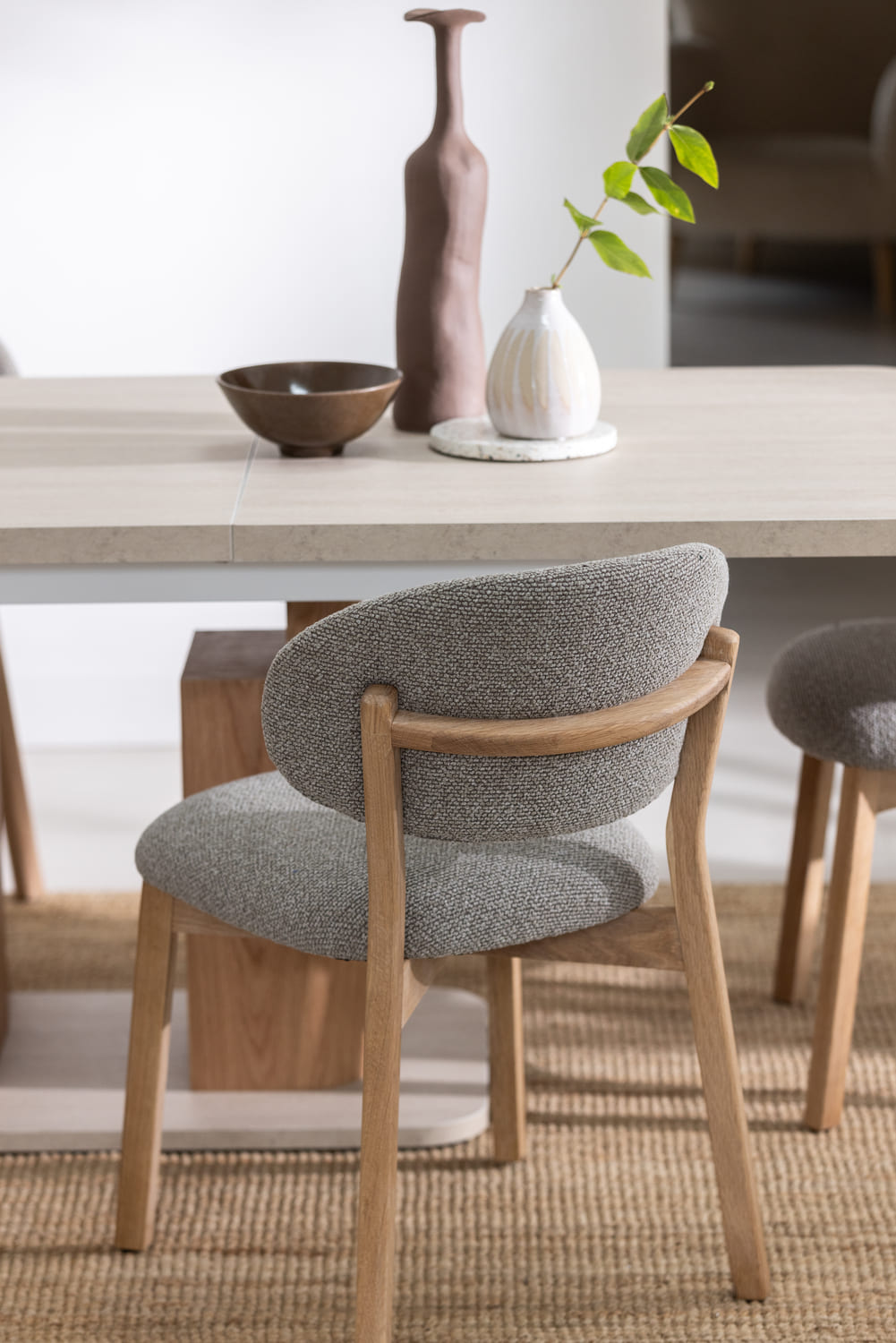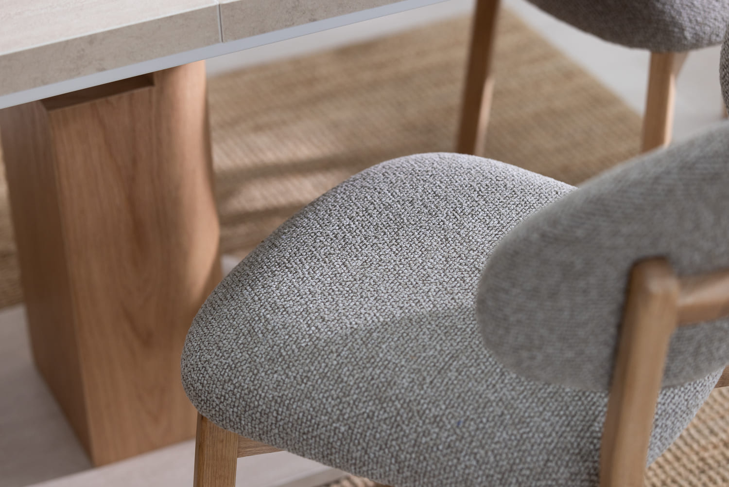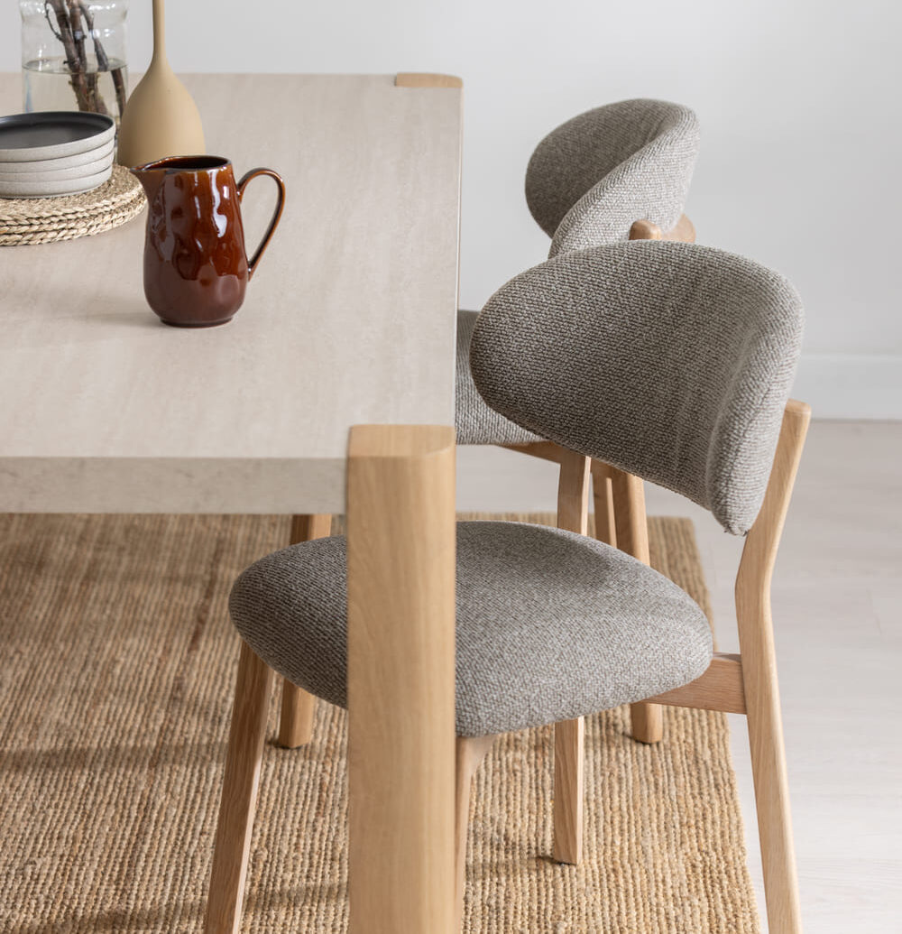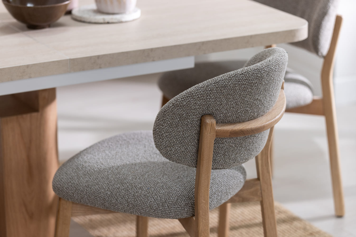 Leo Dining Chair (Pair) – Grey fabric & wooden legs, solid oak with whitewash finish. Rustic charm meets modern comfort for any dining space.