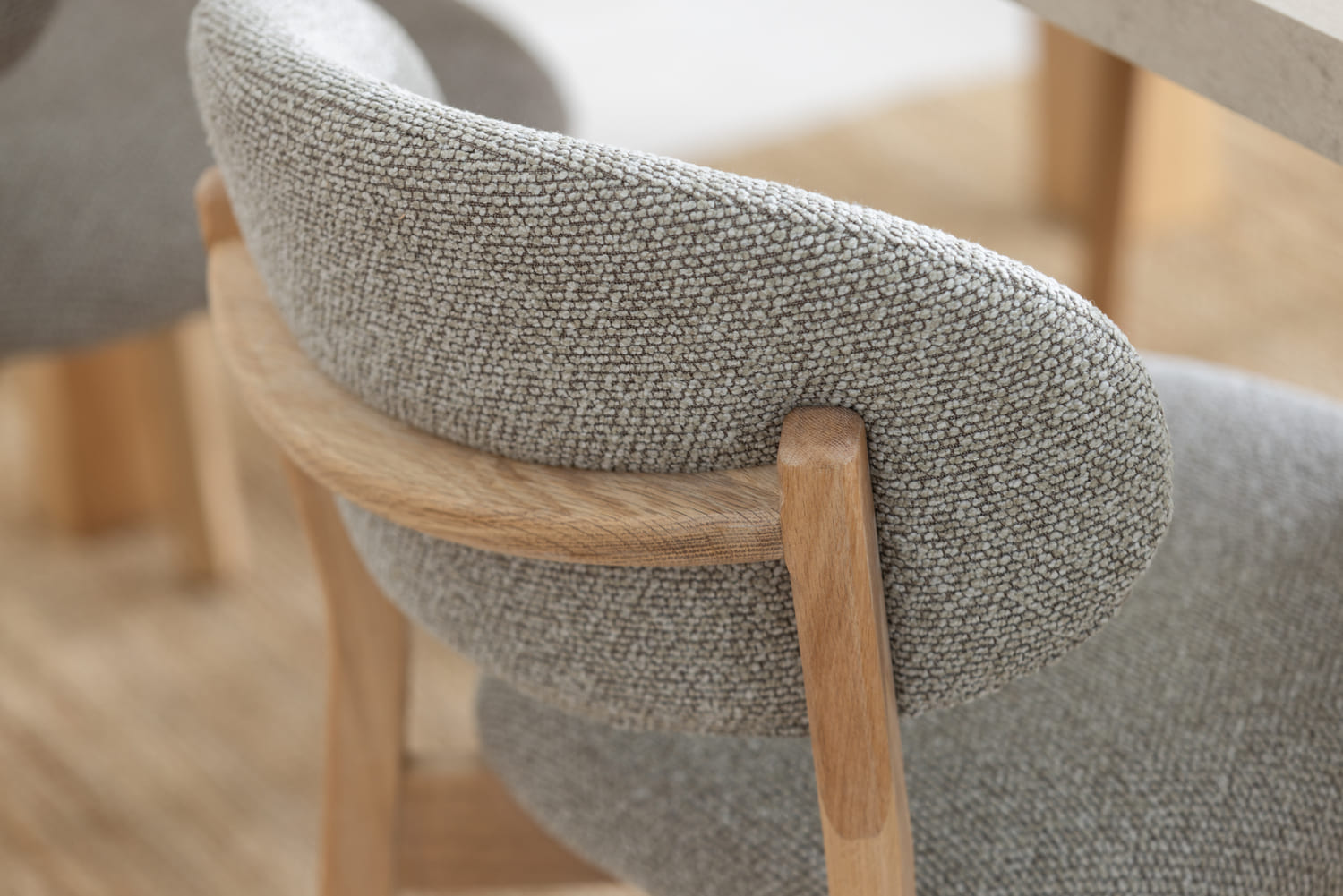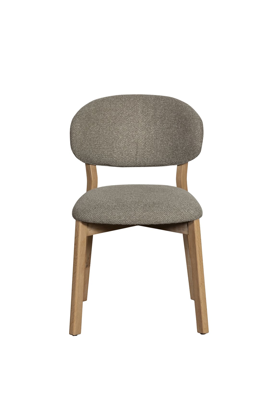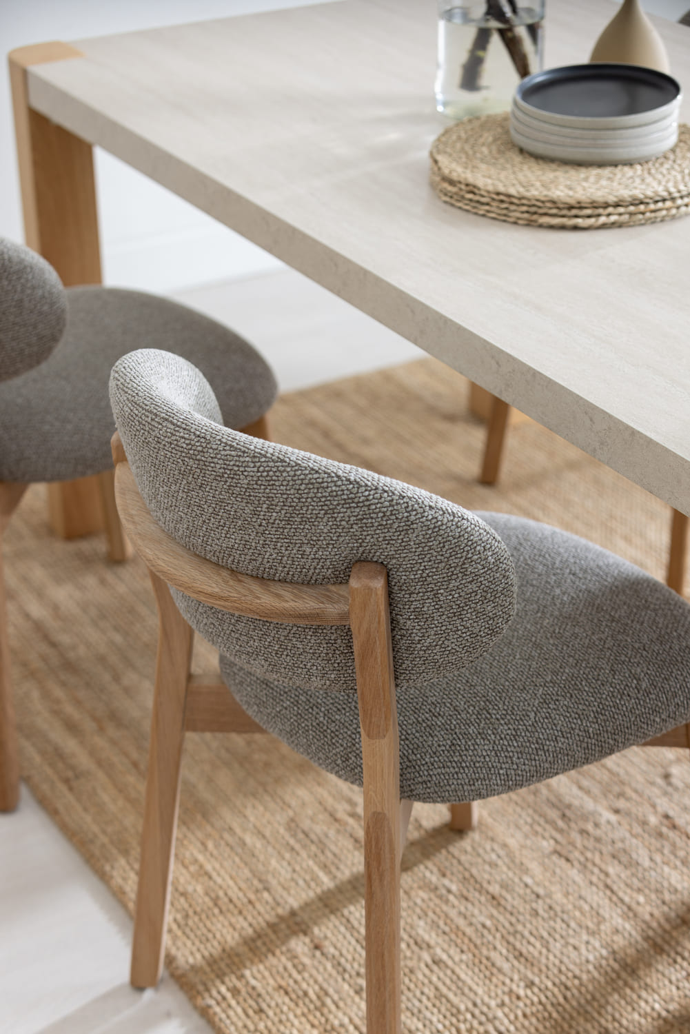 Leo Dining Chair (Pair) – Grey fabric & wooden legs, solid oak with whitewash finish. Rustic charm meets modern comfort for any dining space.