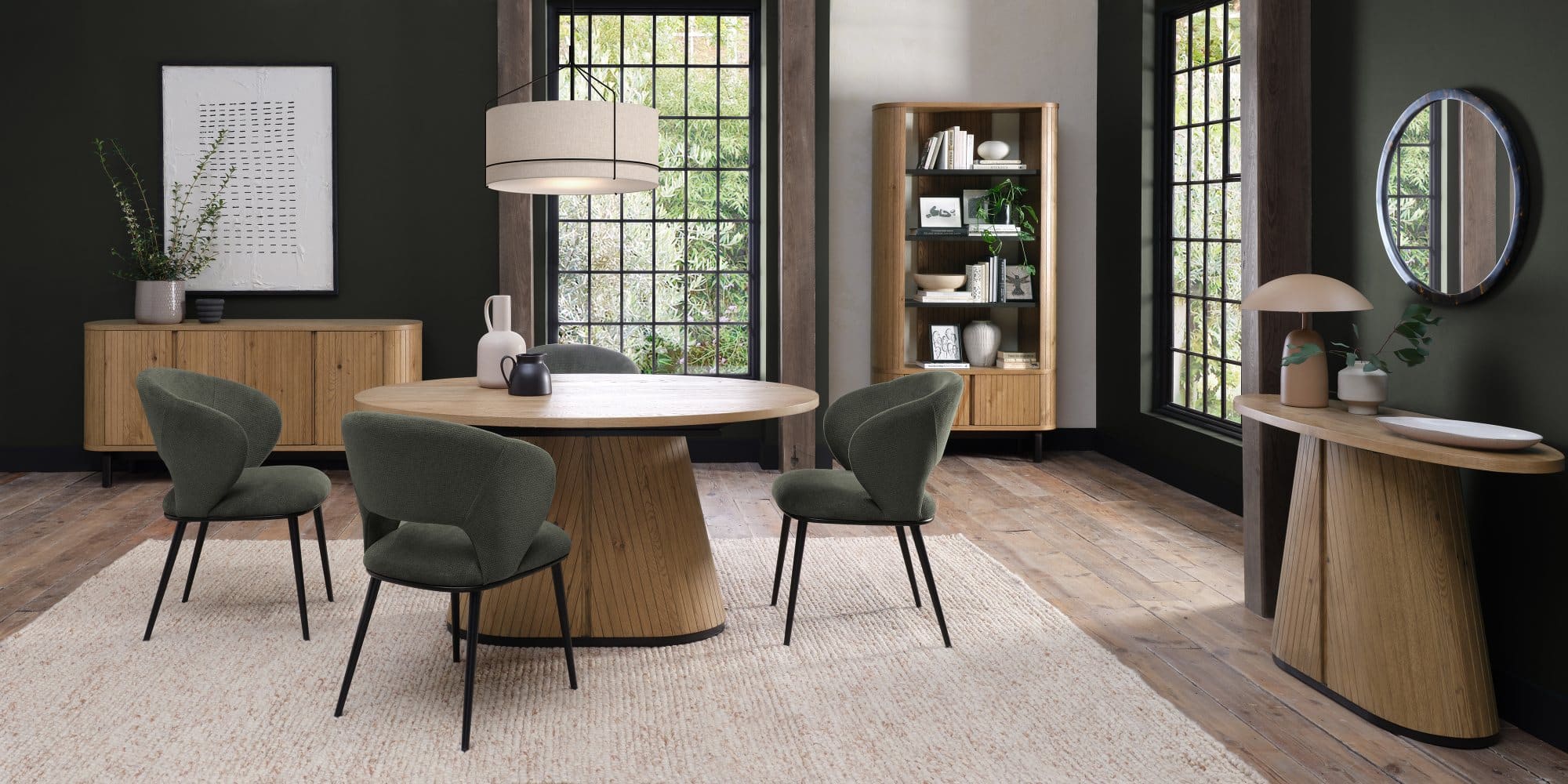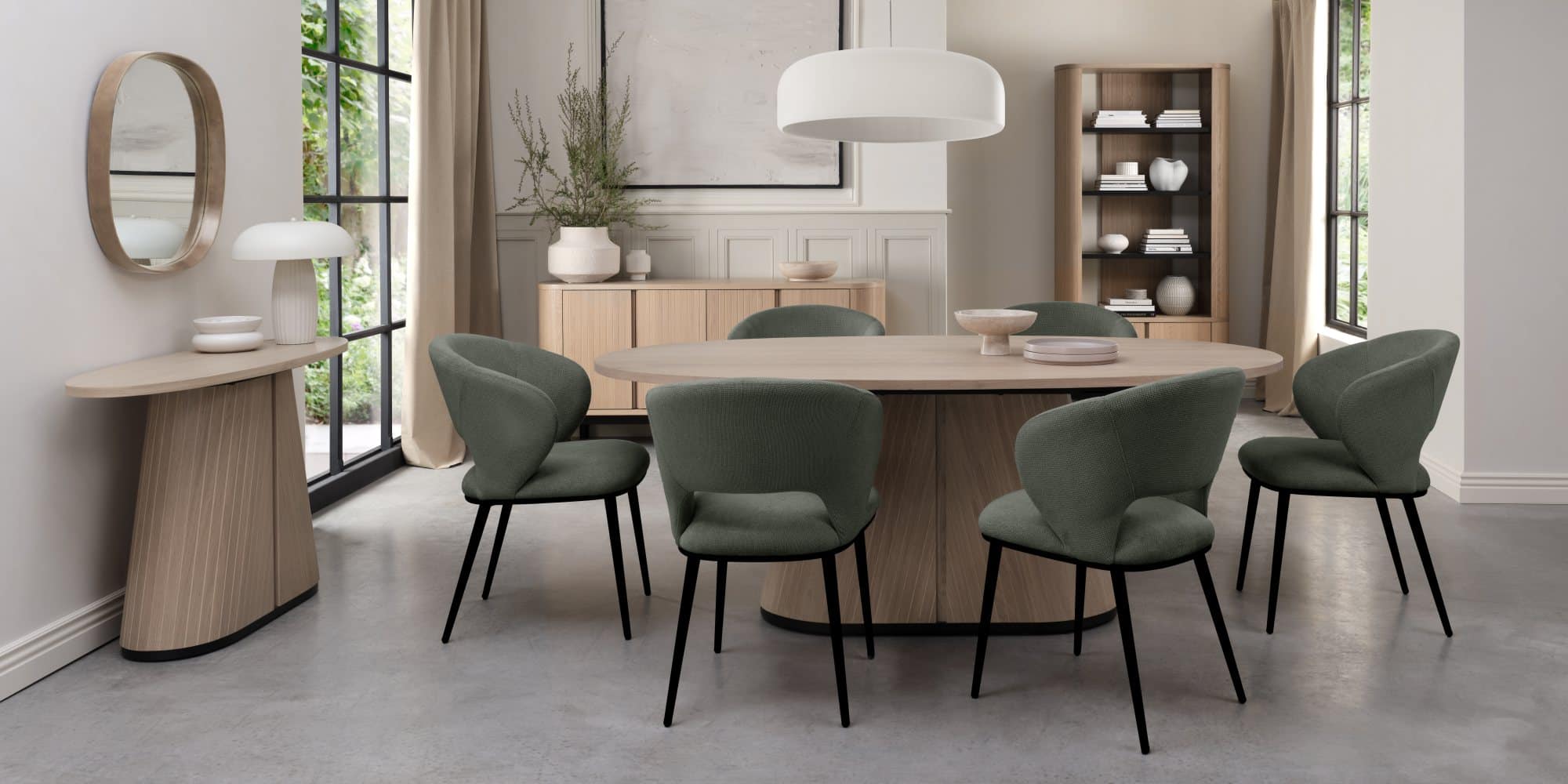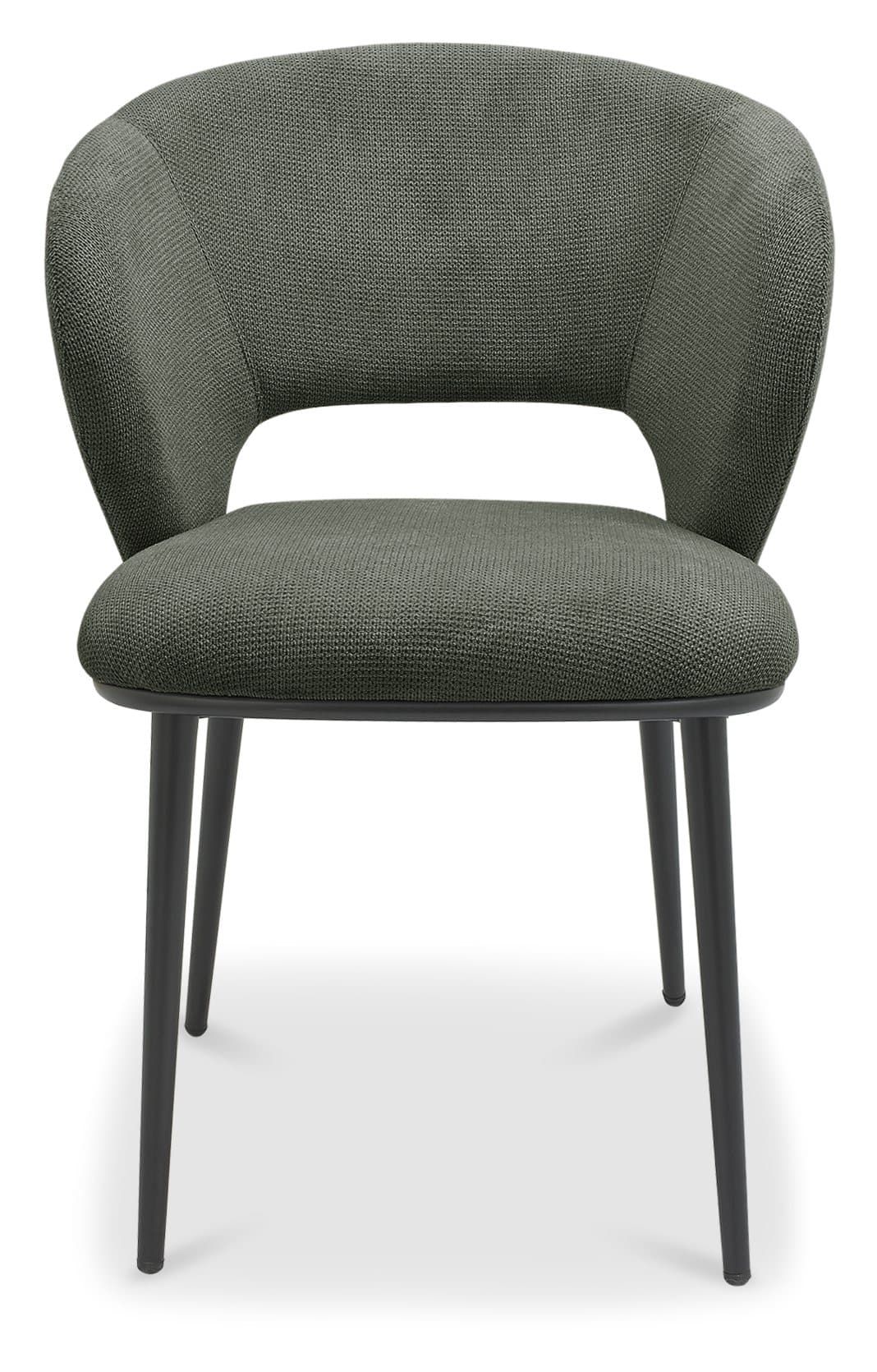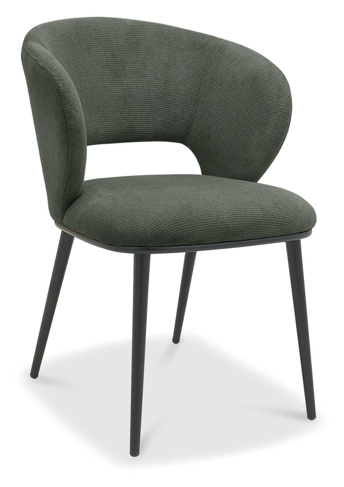 Thoughtfully designed, the Luca chair’s curved back is designed to cocoon around you, offering both comfort and elegance. Upholstered in textured beige, green, or grey fabric, or ivory and light grey faux leather, it provides a range of stylish options. Sleek black metal legs add a modern contrast, making it a design staple that complements many interior settings.