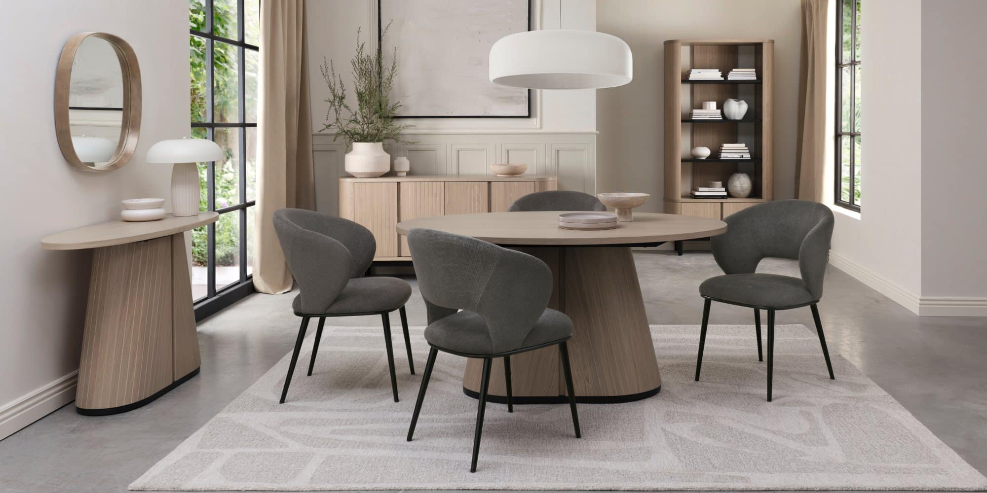 Thoughtfully designed, the Luca chair’s curved back is designed to cocoon around you, offering both comfort and elegance. Upholstered in textured beige, green, or grey fabric, or ivory and light grey faux leather, it provides a range of stylish options. Sleek black metal legs add a modern contrast, making it a design staple that complements many interior settings.