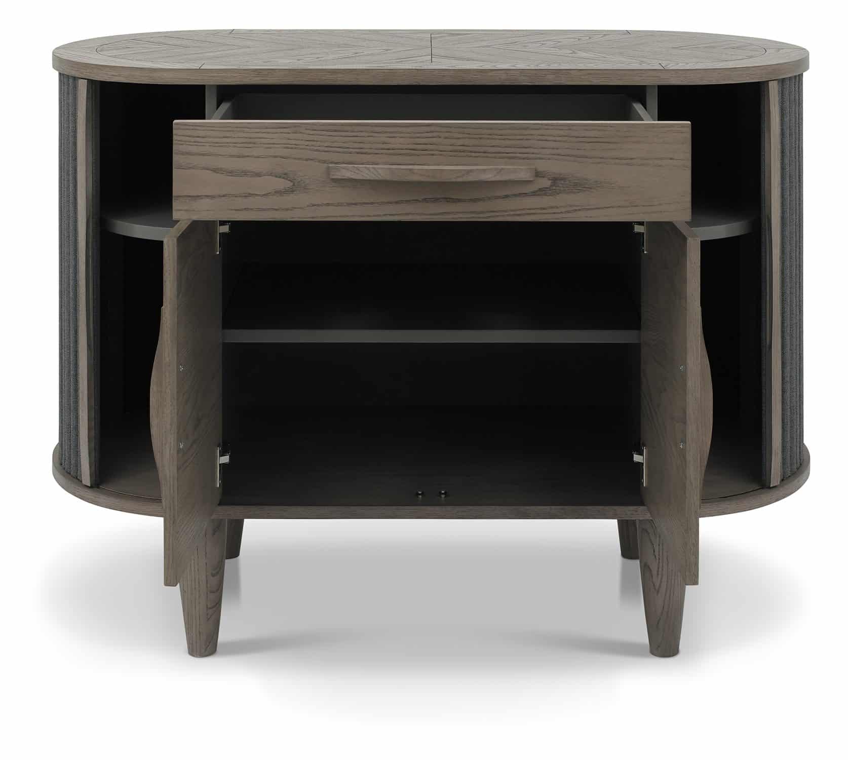 Monroe Silver Grey dining combines classic and contemporary styling to create timeless statement pieces for any home. Comprising of circular and lozenge-shaped forms, this range highlights on-trend, organic and flowing designs that provide a calming feel with softened edges and curves. This aesthetic is accentuated with saw-cut ash chevron pattern on the tables, cabinet tops and display unit which are finished in a fresh silver grey, and accompanied with matching turned tapering legs or contrasted with peppercorn powder coated metal frames. Slate grey fabric upholstered dining chairs and tambour doors complement this palette choice and add texture to pieces such as the sideboard and open display unit, whilst quality touches such as soft-closing runners speak to the craftsmanship and refinement of Monroe.