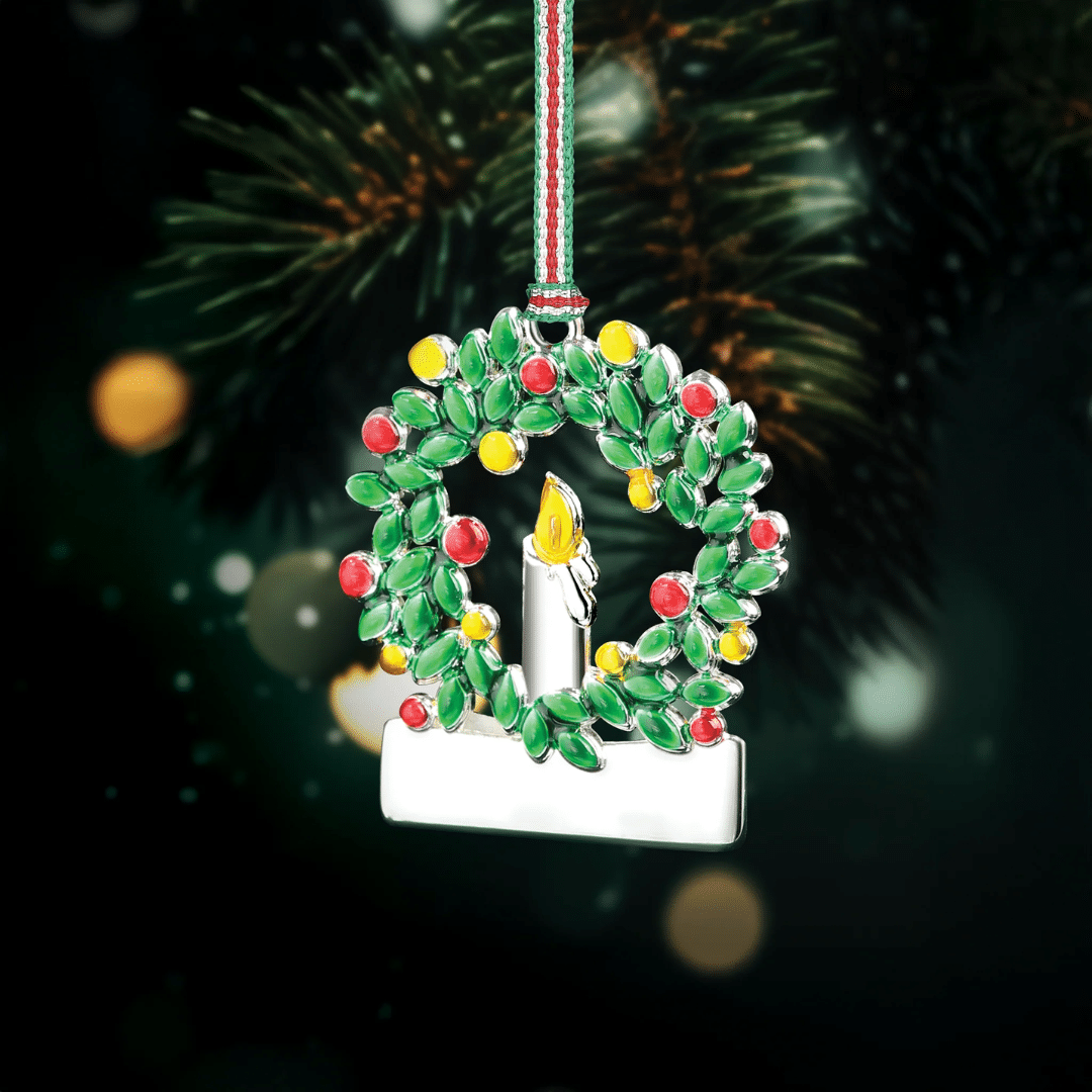 Add a touch of timeless tradition to your Christmas tree this year with this silver plated Wreath with Candle decoration. Featuring a detailed green coloured wreath accented with red and yellow and the glow of the golden candle light, a symbol of peace and welcome. Suitable for personalisation this decoration is a great gift for those who love the tradition of classic Christmas celebrations.