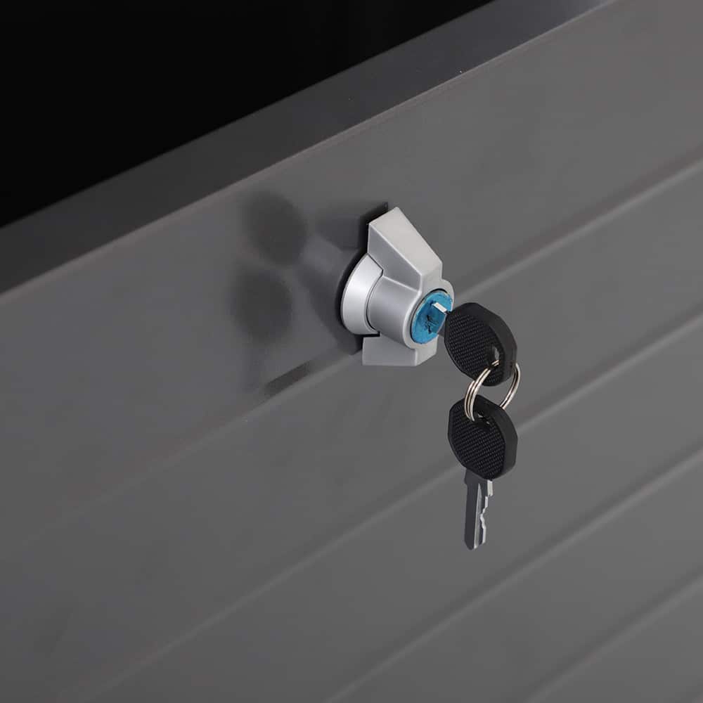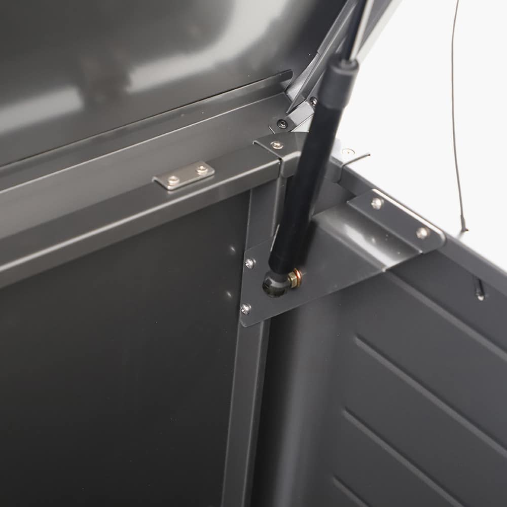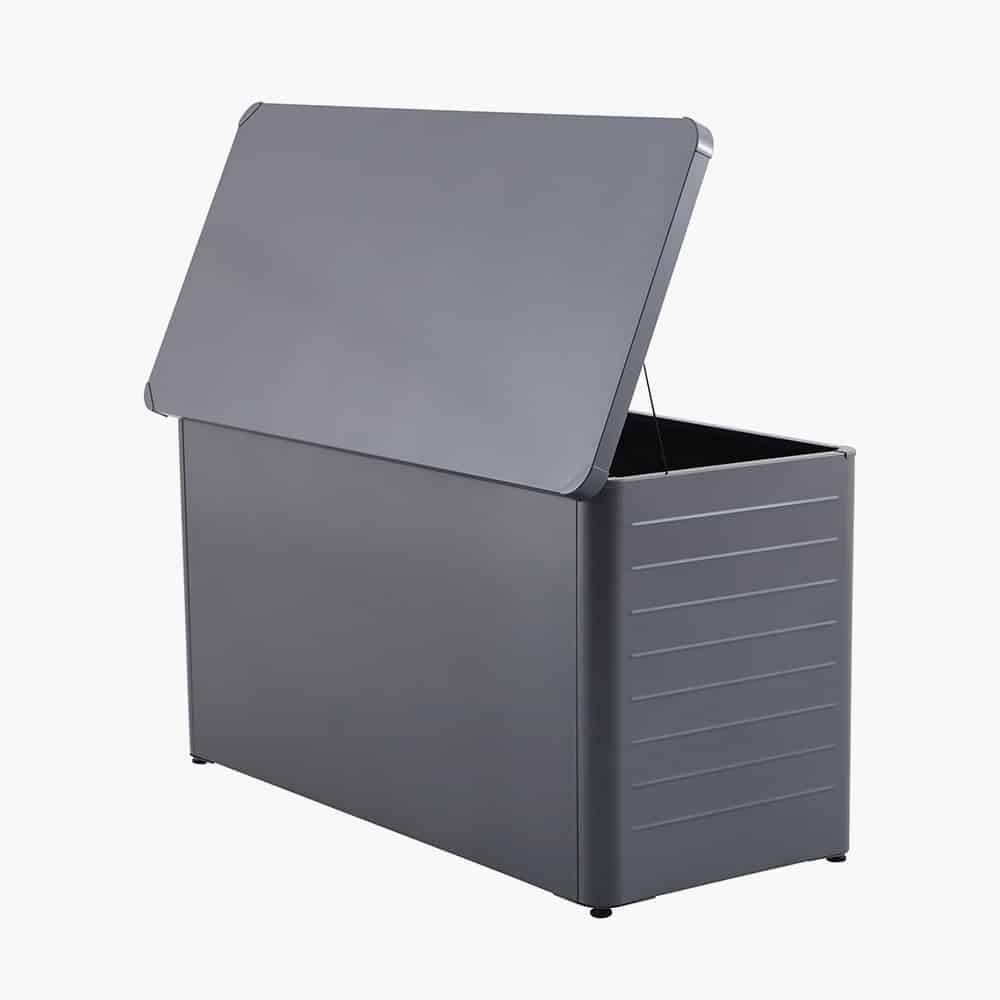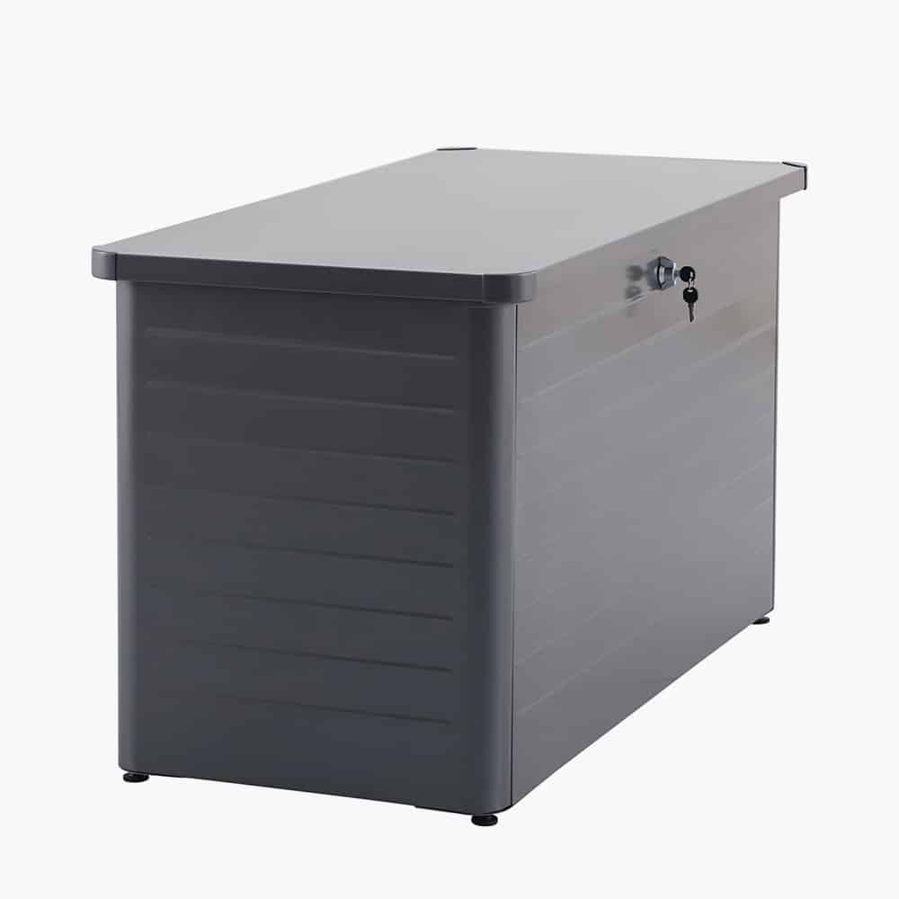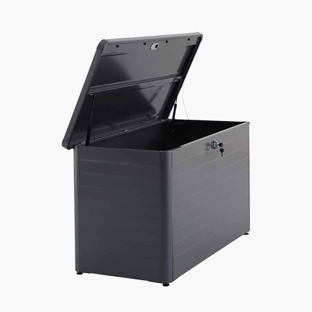 Our Rhode Island Large Steel Cushion Box is made from galvanised steel, perfectly formed to store your cushions whilst not in use, in a black hue. The outdoor storage box features a contemporary slim, close-lat design, with gas pump hinges and adjustable feet for ease of movement when required. There is also a lock and key for your security.