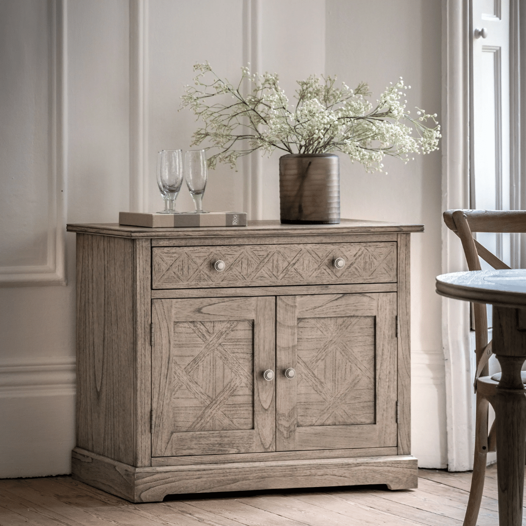 This 2 door sideboard offers a practical storage solution, with its large drawer and cupboard below. The doors, drawer fronts and top feature the signature parquet-style design, with the doors having this as an inset centre panel to add an extra design feature.