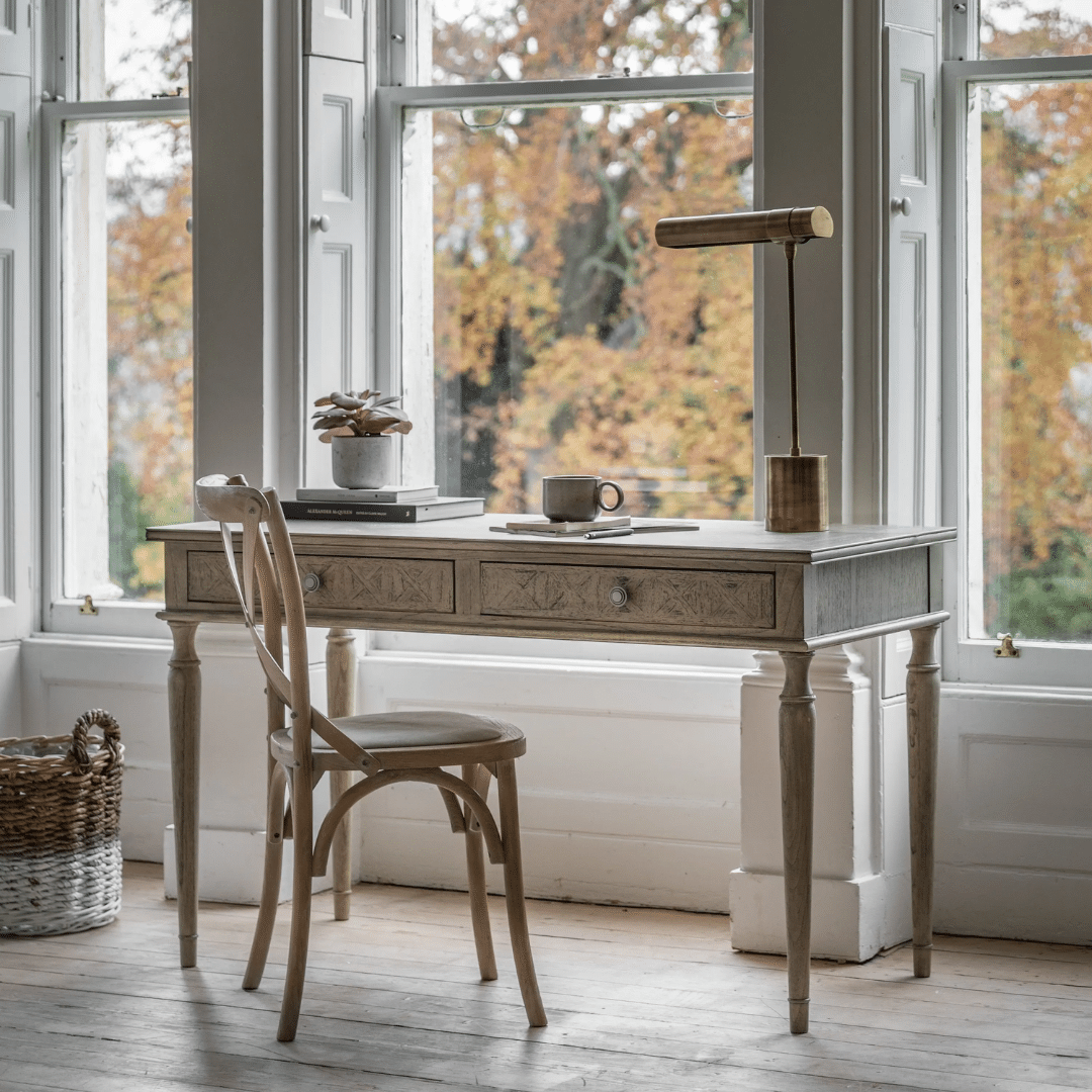 With its beautiful inlaid parquet design and elegant turned legs, this 2 drawer desk oozes effortless style and appeal. Made from Mindy wood which is lightly brushed to recreate a natural ageing effect, its subtle finish and classy design suits a range of interiors. The 2 drawers add practical storage, to help keep tidy.