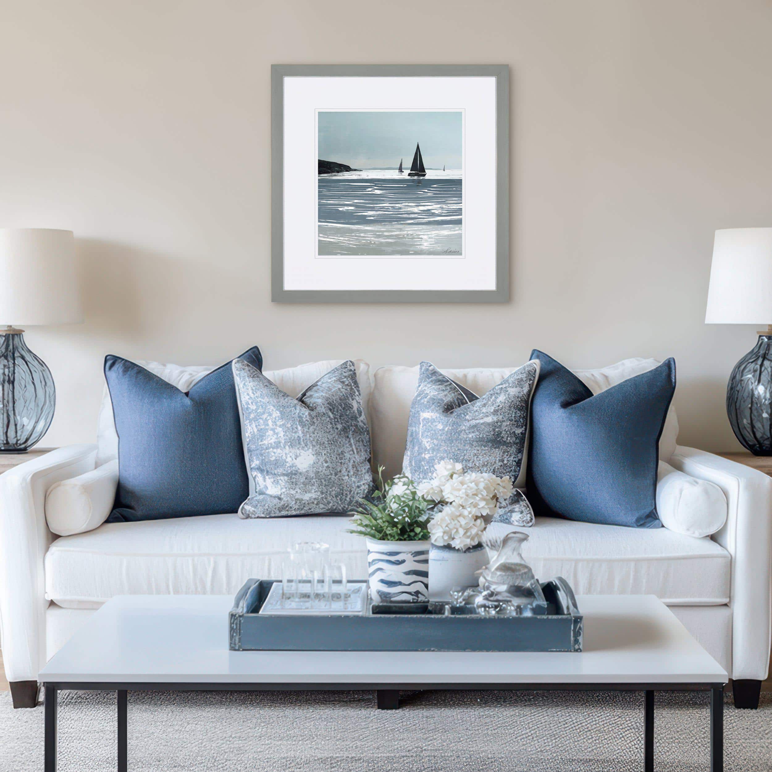 - Colour:Â Soft grey and blue print. Warm grey frame with silver edging