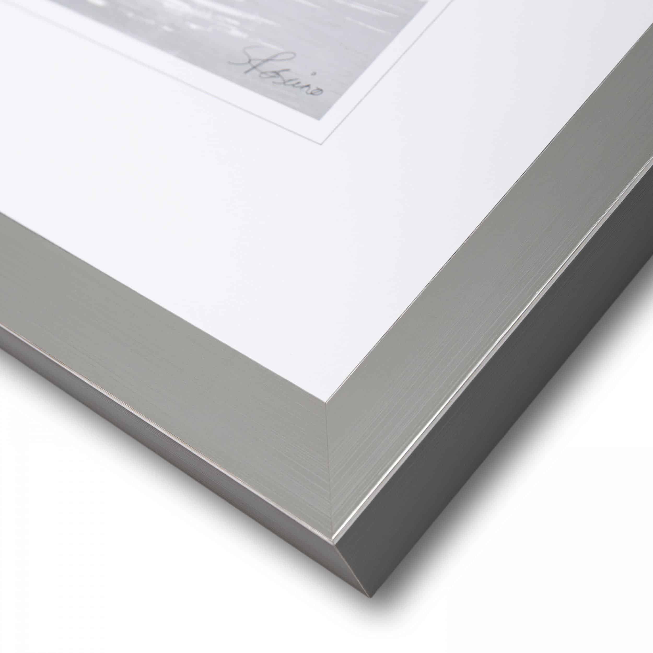 A decorative textured grey frame with silver edging completes this glazed wall art.