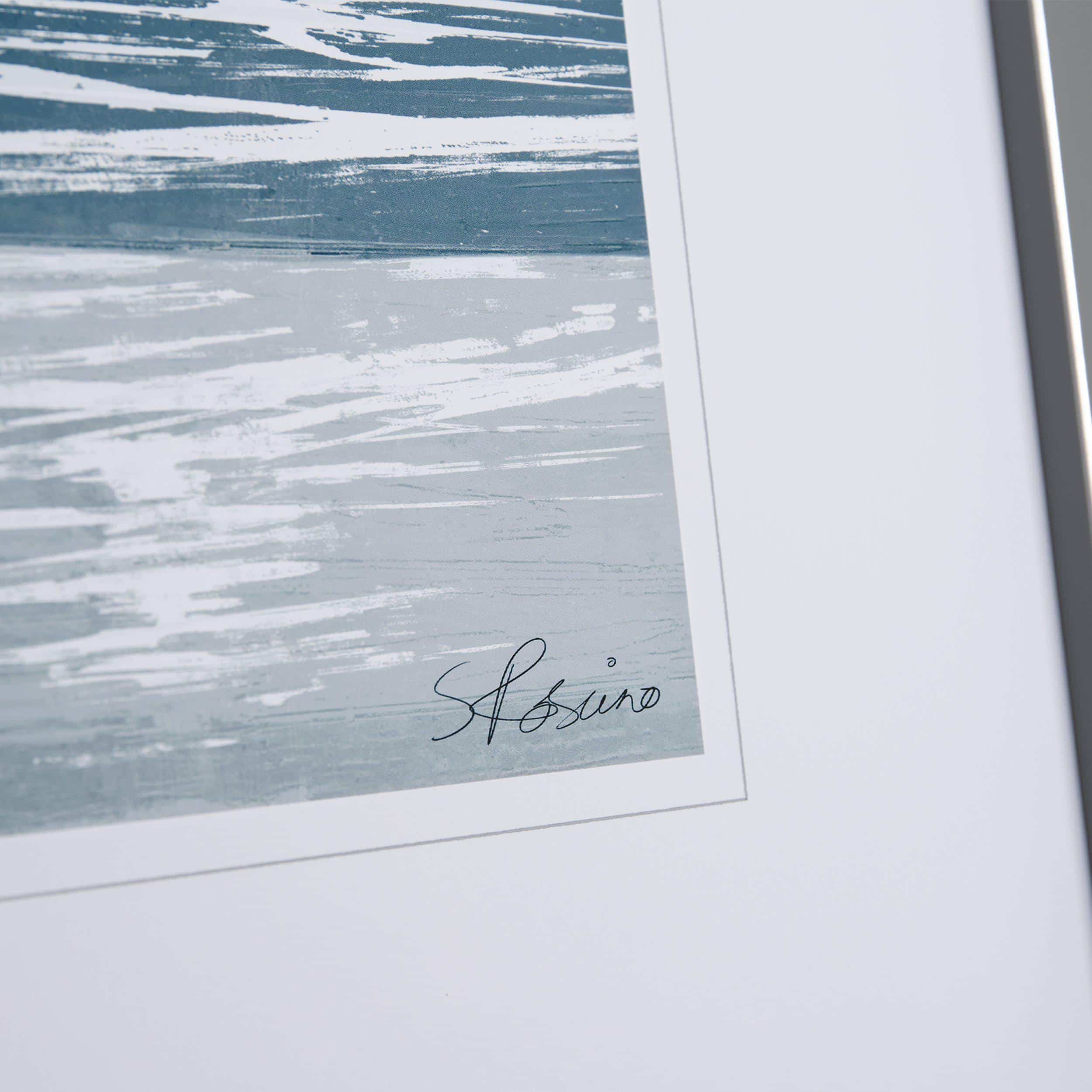 As the clear blue sky transitions into a summer evening, Sabrina Roscino’s captivating coastal vista beautifully captures the light dancing across the calm water. A simple blue colour palette captures the contrast between the sun’s energy and the tranquillity of the sea. The extraordinary composition is delicately painted in watercolour, embodying serenity and freedom through its expansive landscape.