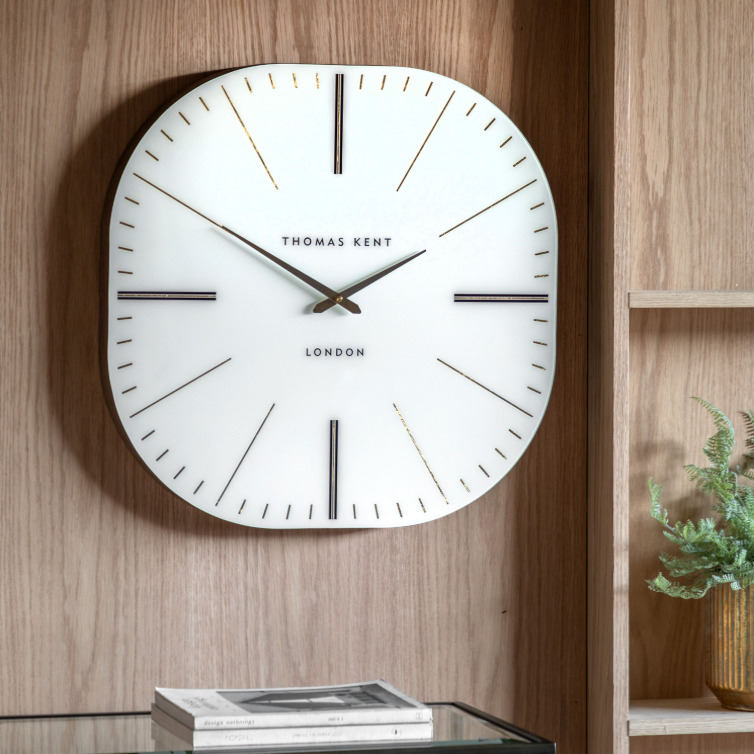This eye catching clock reimagines modern timekeeping thanks to its soft geometry and refined detailing. Elegantly framed by a rich wood finish edge and a sleek snow white glass front, gold accents and minimalist markings create a sophisticated, contemporary look, perfect for interiors that embrace understated luxury and modern design.