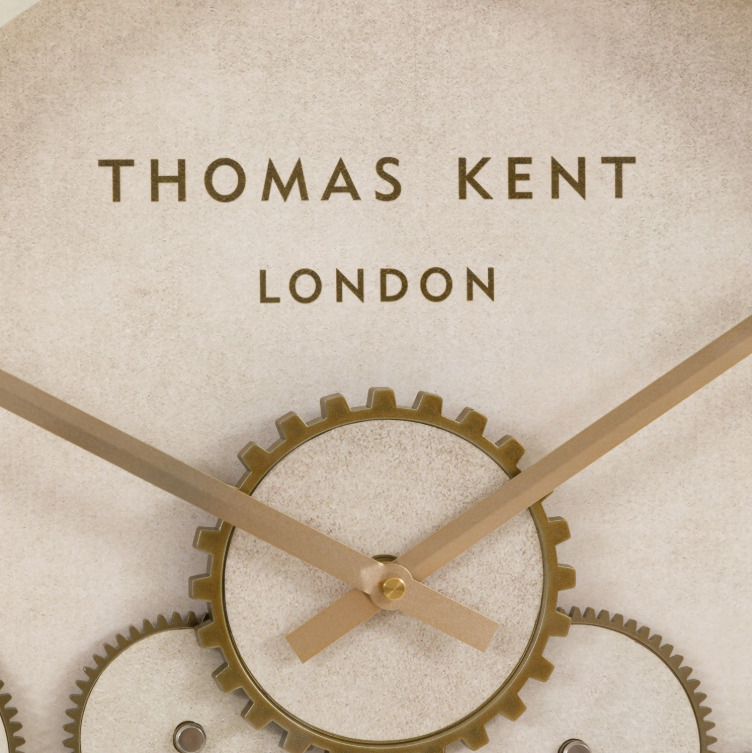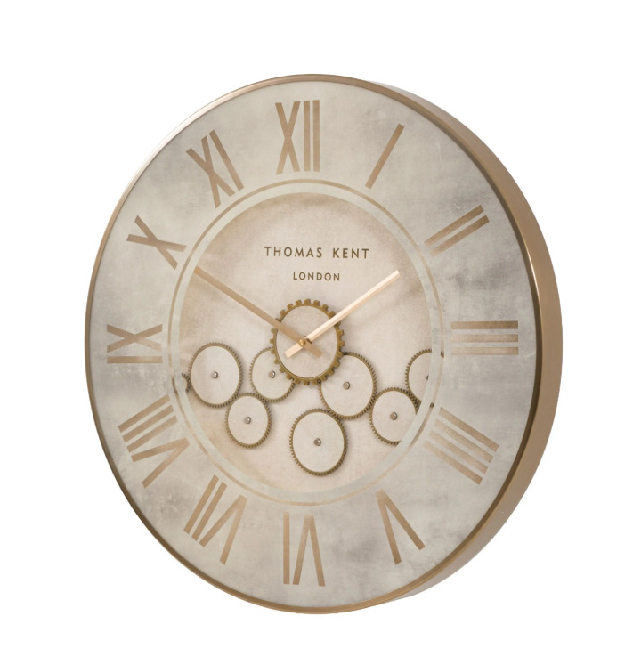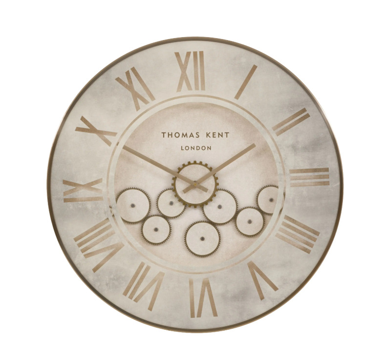 Thomas Kent Cog Stone Wall Clock with moving cogs, antique glass face, Roman numerals, and bronze frame—perfect for a timeless, elegant interior touch.