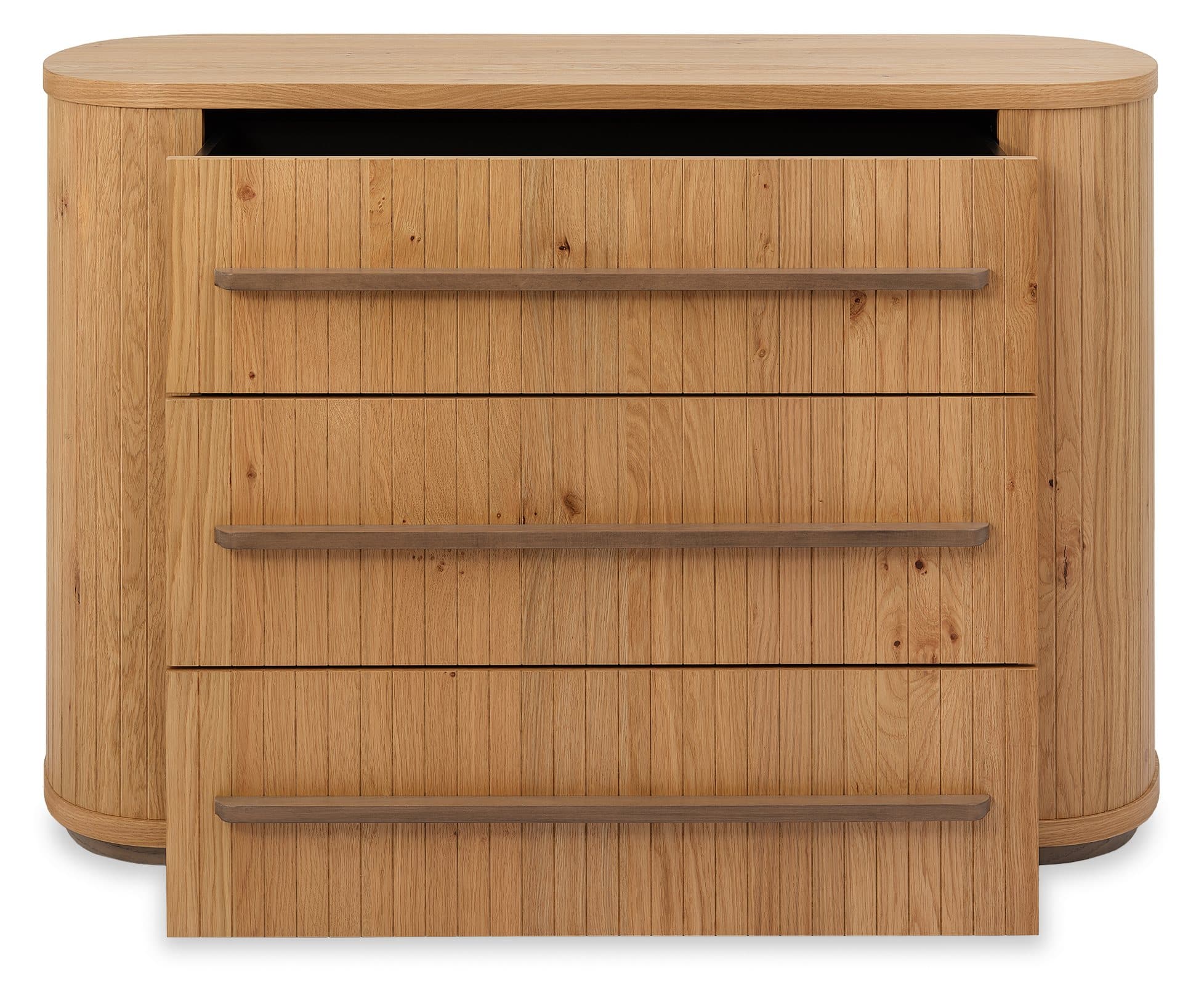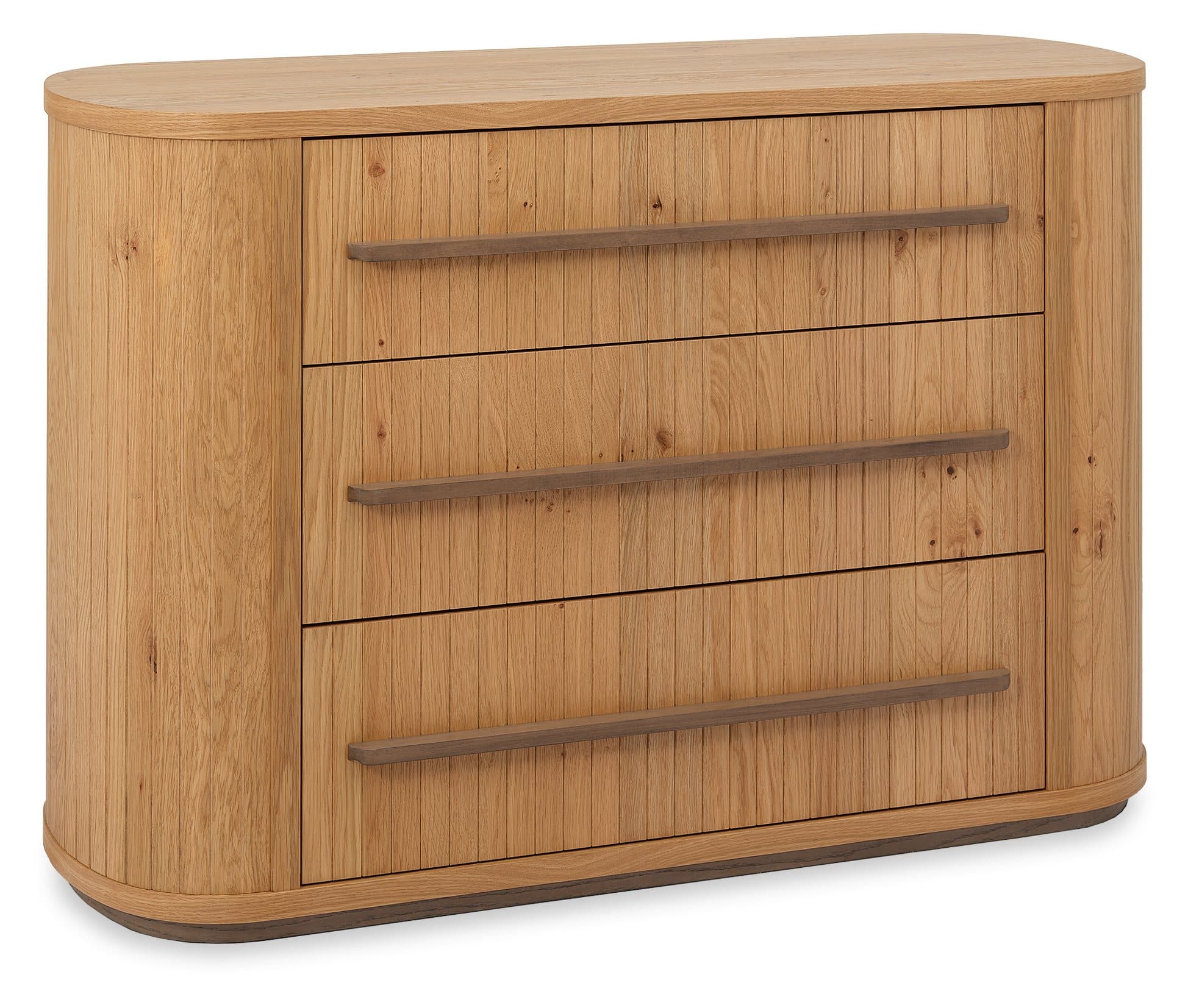 The Vega Bedroom Range brings a sense of crafted character to contemporary spaces, combining knotty oak veneers with a soft weathered finish and expressive grain. At its centre, the bed frame sets a confident tone with turned oak legs and a pearl crushed velvet headboard that introduces texture and contrast. Curved profiles and subtle groove detailing run throughout the range, lending cohesion and balance to each piece. Generous drawer storage is provided through softly contoured chests and elliptical nightstands, available in both three-drawer and open-shelf variations to suit a variety of room layouts and lifestyles. The Dressing Table pairs a central drawer with shelving concealed behind its pillar-like sides, offering a streamlined look with functional detail.