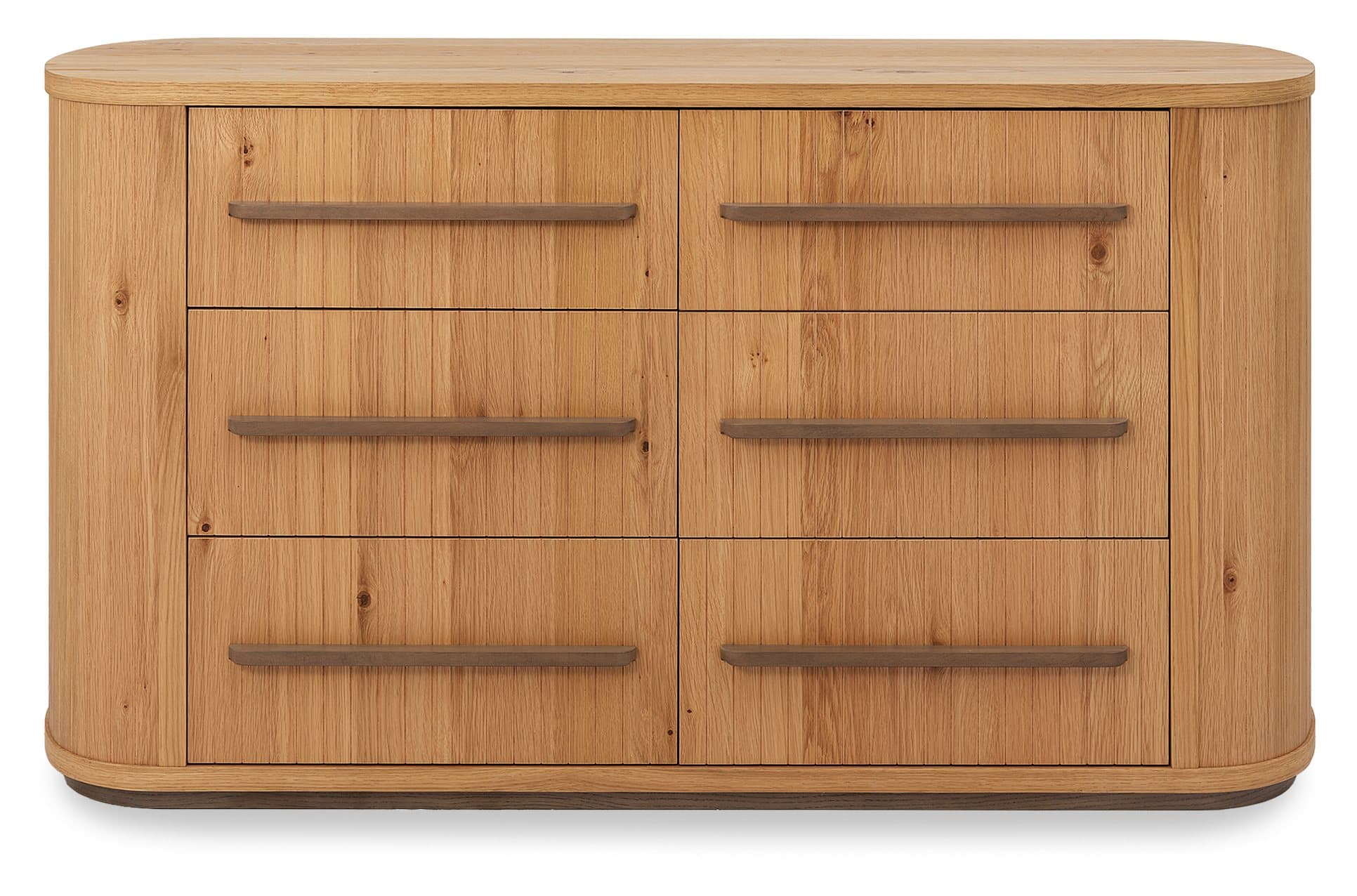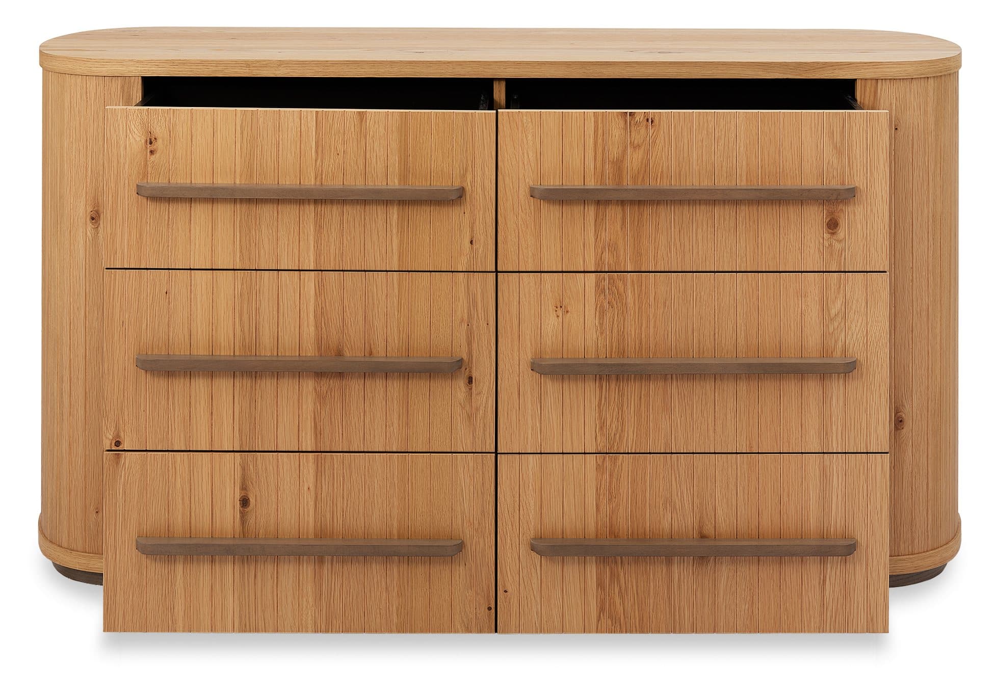 The Vega Bedroom Range brings a sense of crafted character to contemporary spaces, combining knotty oak veneers with a soft weathered finish and expressive grain. At its centre, the bed frame sets a confident tone with turned oak legs and a pearl crushed velvet headboard that introduces texture and contrast. Curved profiles and subtle groove detailing run throughout the range, lending cohesion and balance to each piece. Generous drawer storage is provided through softly contoured chests and elliptical nightstands, available in both three-drawer and open-shelf variations to suit a variety of room layouts and lifestyles. The Dressing Table pairs a central drawer with shelving concealed behind its pillar-like sides, offering a streamlined look with functional detail.