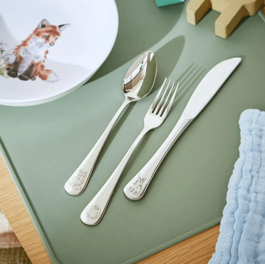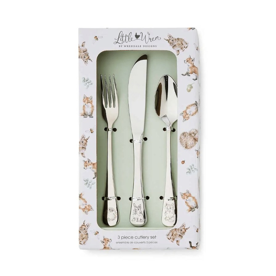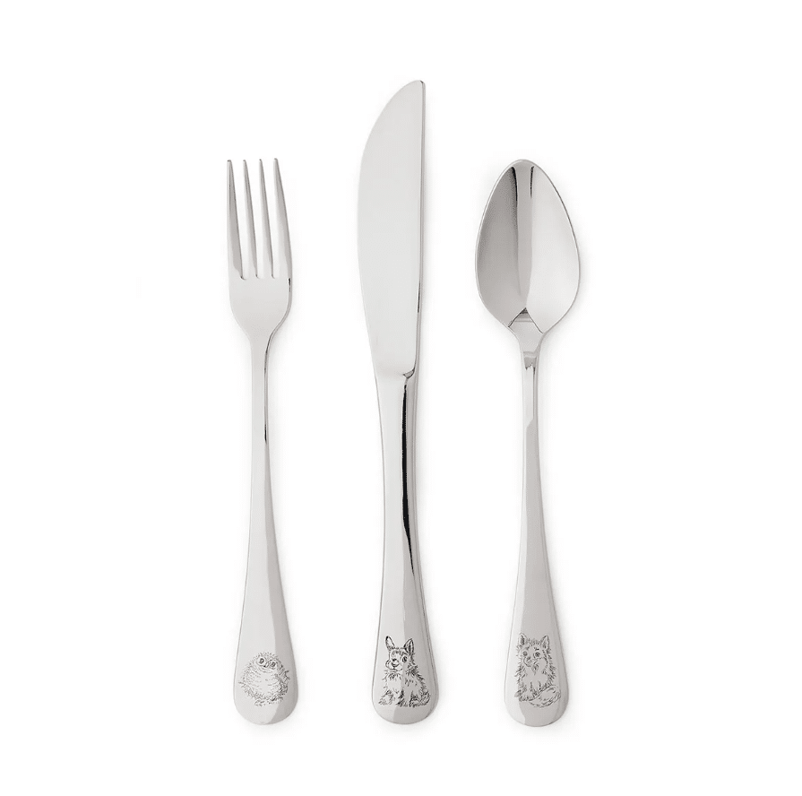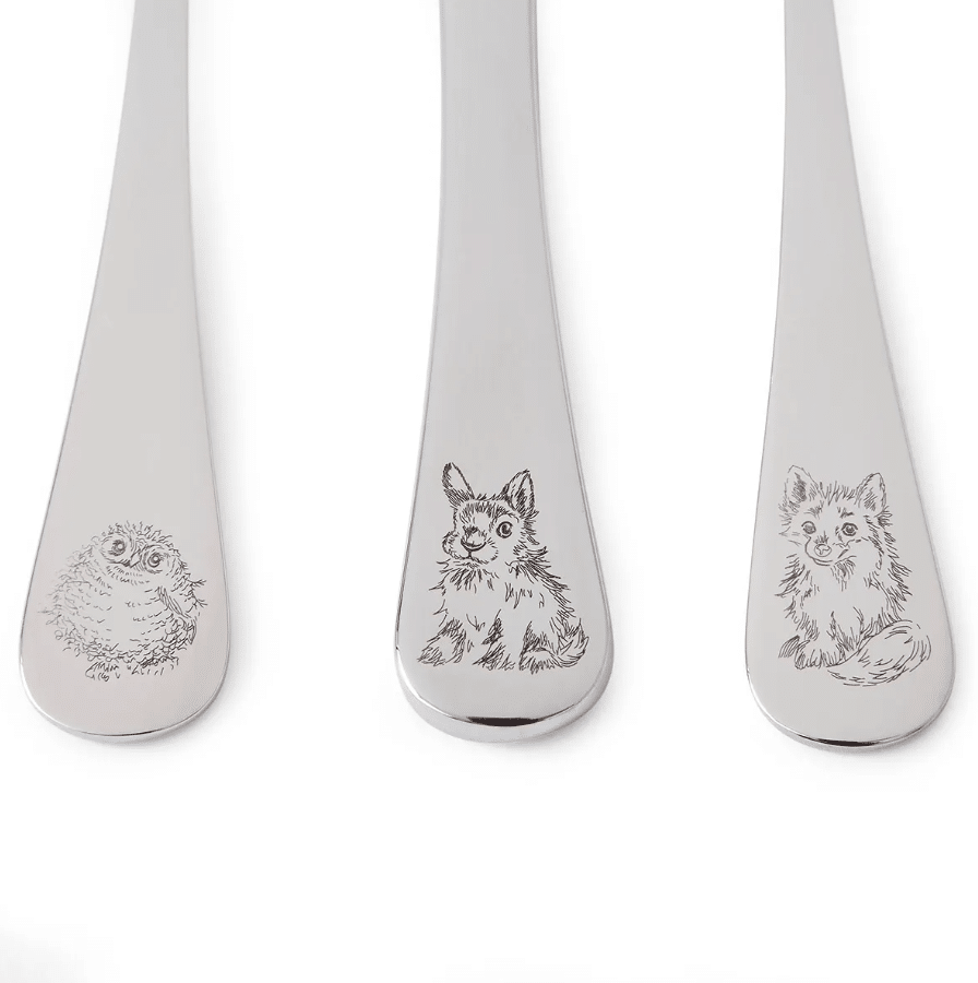 Made from stainless steel, this Little Wren Cutlery Set from Wrendale Designs includes a knife, fork and spoon suitable for toddlers and small children. A classic design that looks stylish on the table, while allowing little ones to feel just as important with their very own set. Designed with small hands in mind, each handle is finished with a gorgeous etched illustration of a baby woodland animal, including an owl, fox and rabbit. Presented in a gift box, it makes a wonderful first set for children.